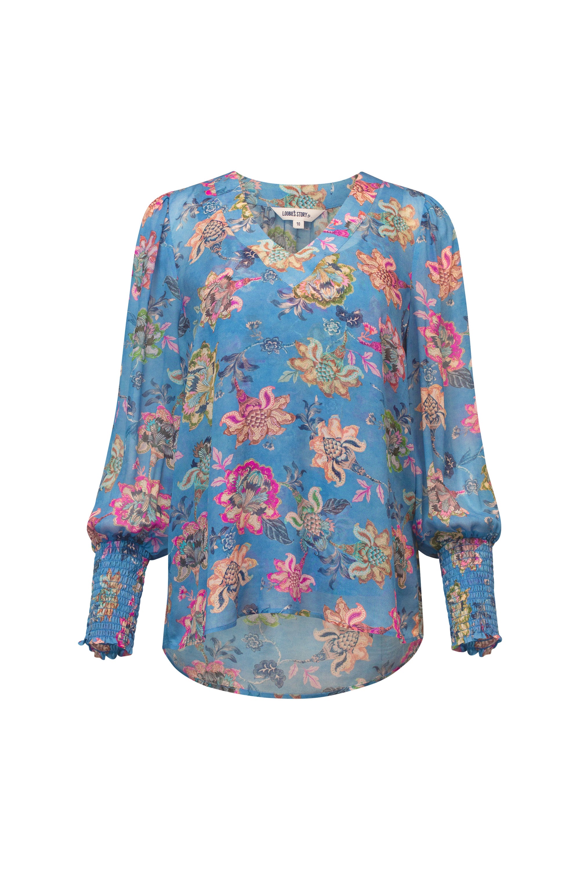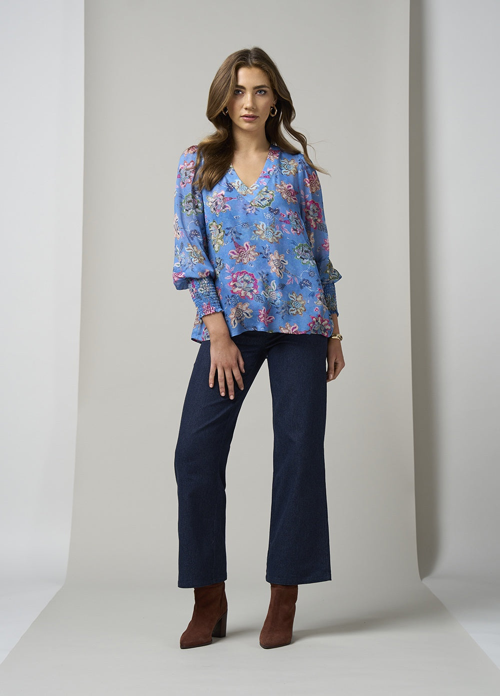 Printed V-neck blouse, with blouson sleeves gathering into deep shirred cuffs. Printed A line cami included.