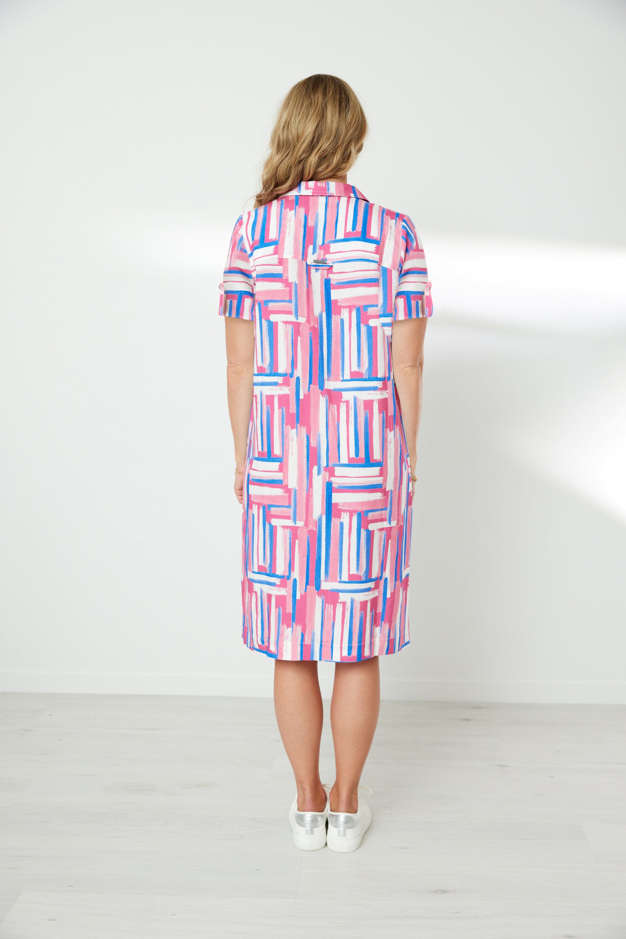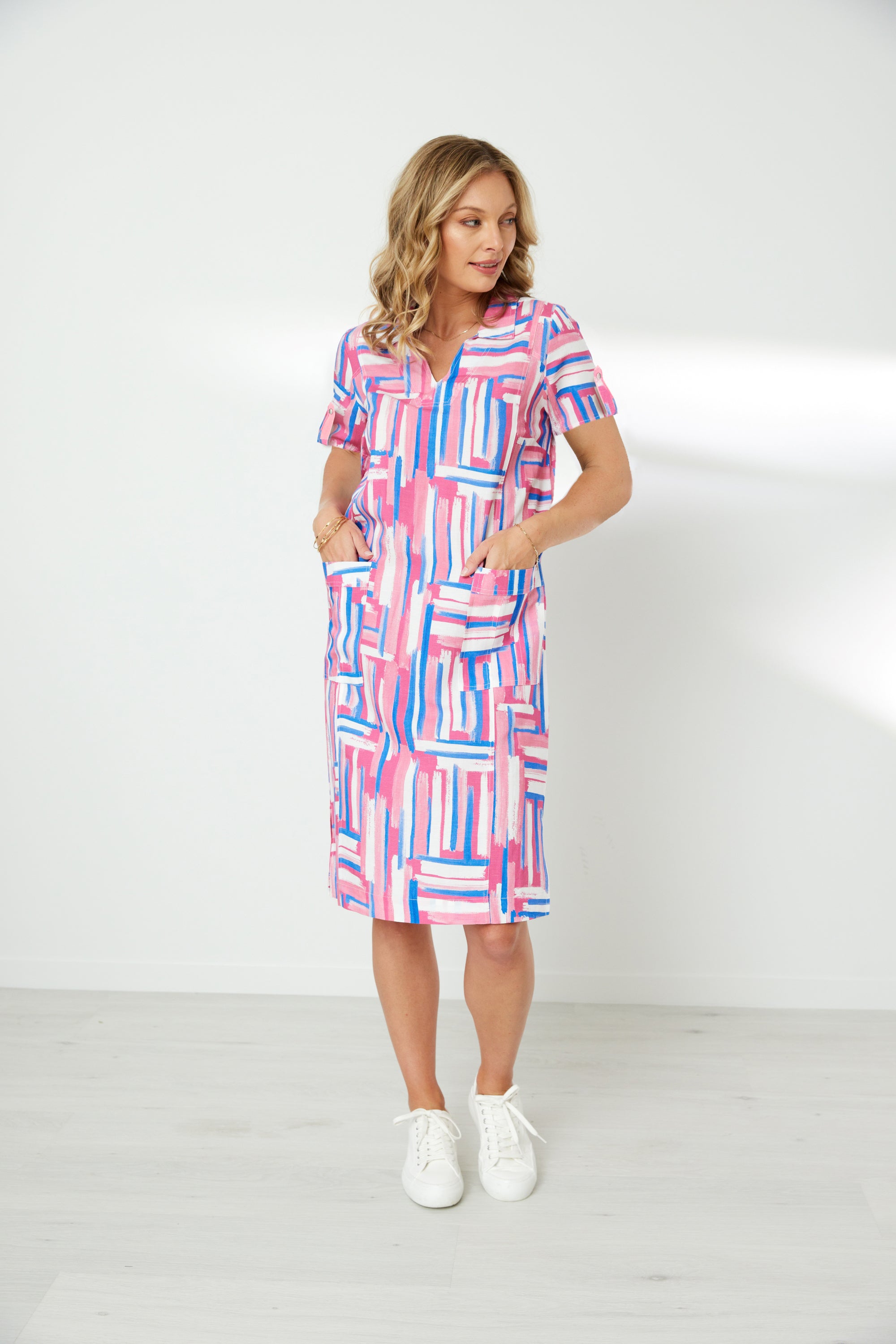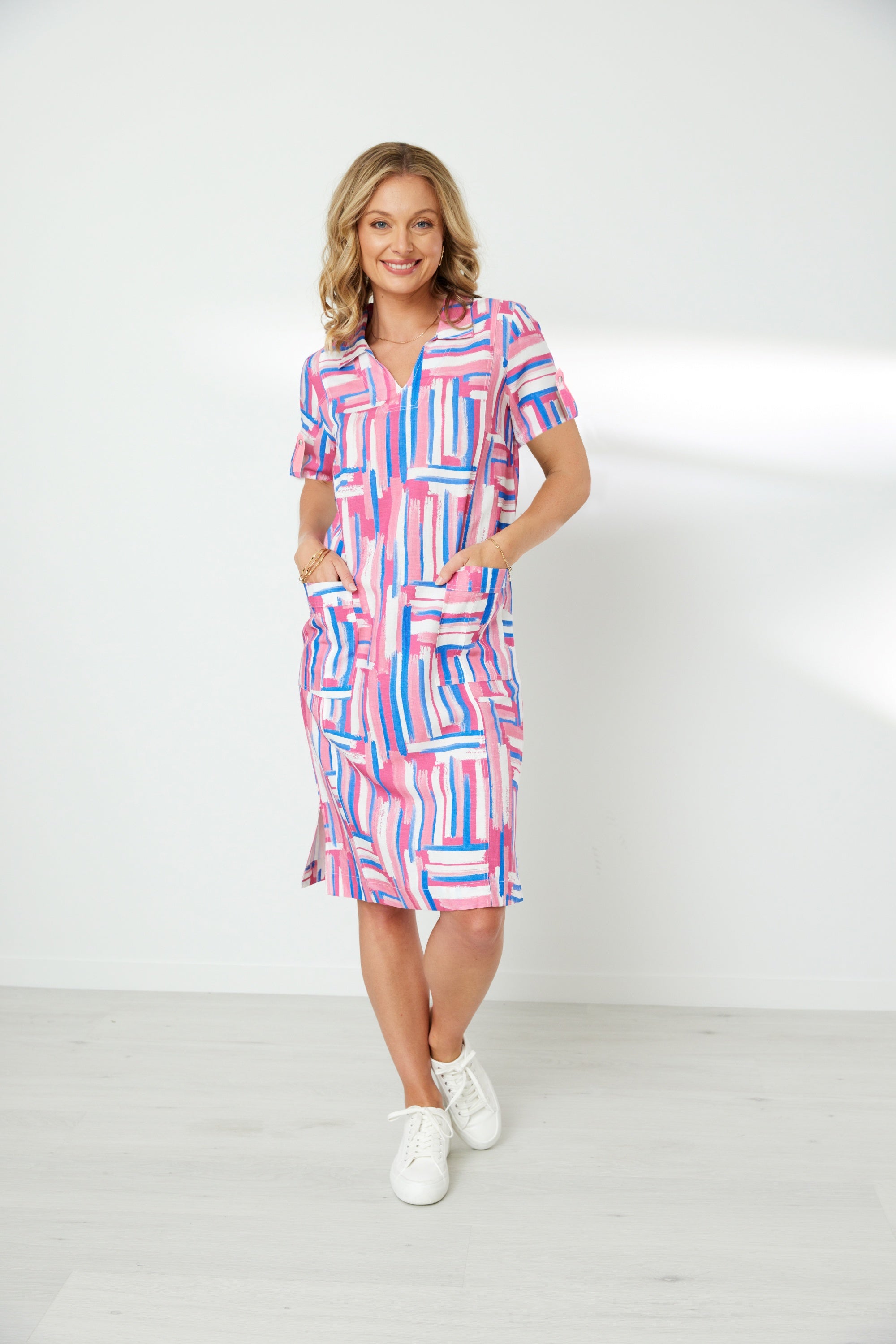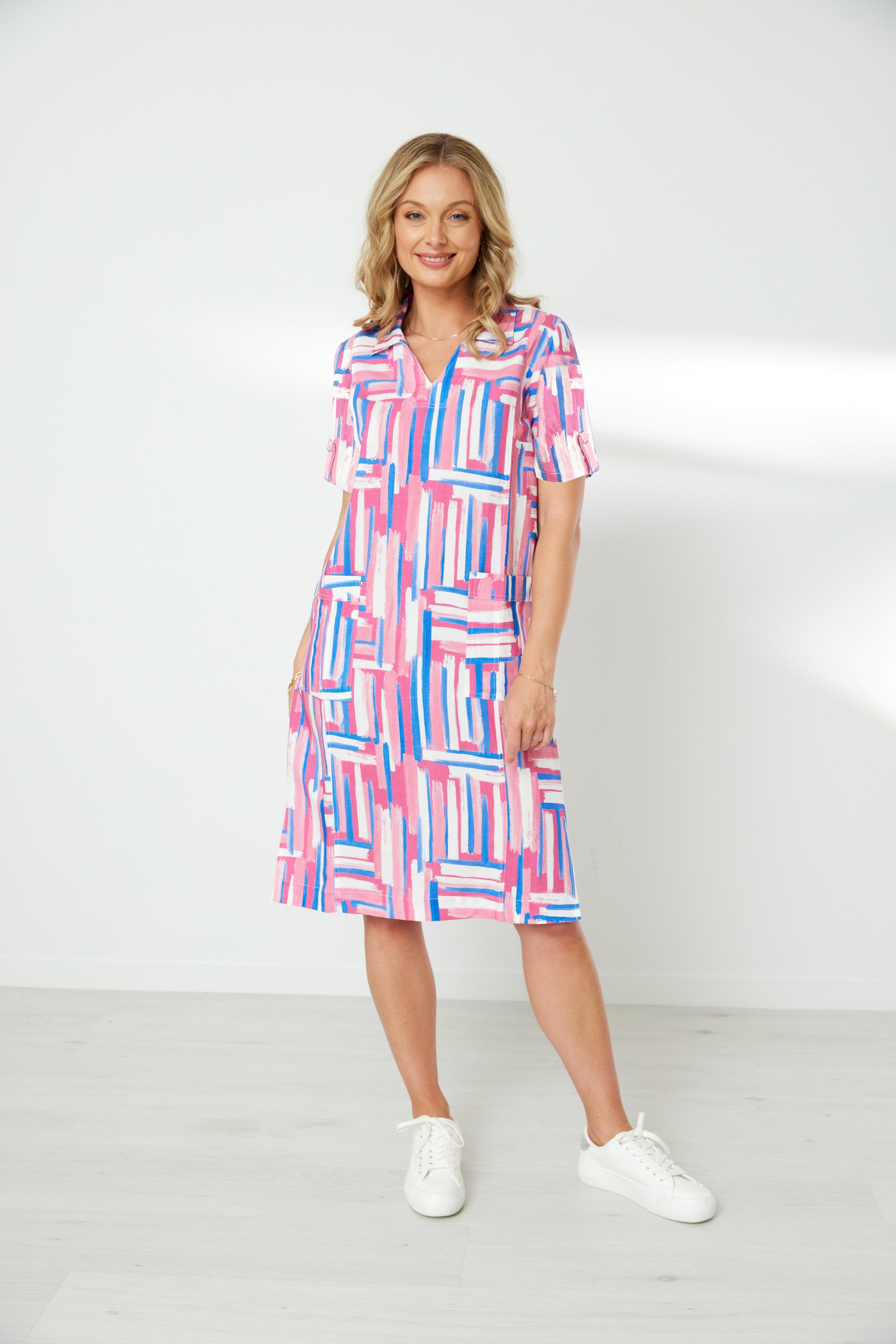 Printed shift shape dress with collar & notched neck. Patch pockets at front waist. Short sleeves with roll up tab to adjust sleeve length. Back yoke. Hem has side splits.