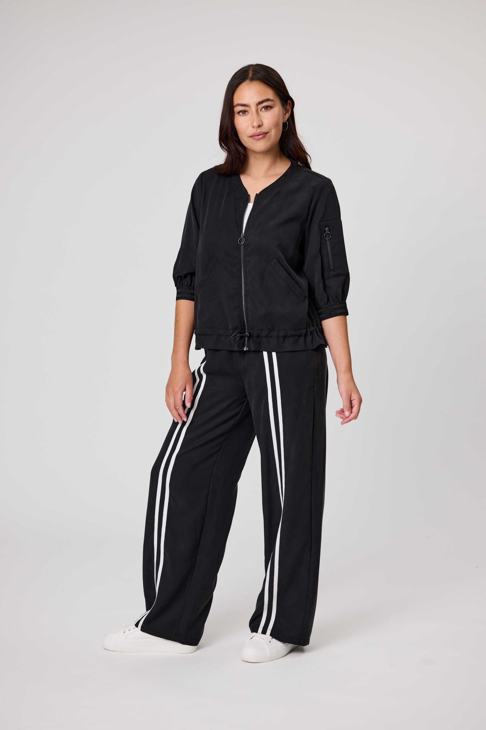 Plain zip front casual jacket .Set in 3/4 sleeve length with elasticated cuffs. Zipped pocket at left sleeves and two welt pockets at front. Internal adjustable toggles at hem.