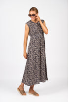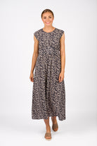 The Global Dress in the Soul print is an elegant midi-length style made from a lightweight rayon-nylon blend. A softly gathered waist and subtle flare through the skirt create a flattering silhouette, while the drop shoulder and relaxed fit add an effortless feel.