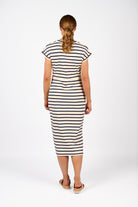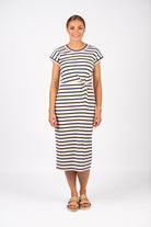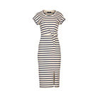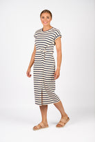 The Parker Dress is made from soft stretch cotton knit fabric and features a drop shoulder with short sleeves and a twist detail at the waist. With a wide fit through the chest and a shaped waist and hips, it offers a flattering silhouette and a side front split for ease of movement, making it ideal for relaxed yet polished looks.