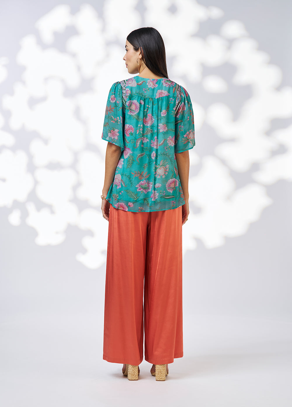 Printed, sheer blouse with a shirred front yoke to create a subtle sweetheart V-neckline. Featuring contrast printed shoulder panels at top of floaty sleeves. Lined through body.
