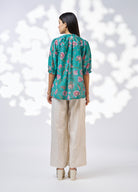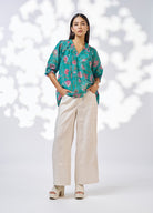 Silk cotton voile top with a ruched V-neckline, with tuck detailing, and ruffle raglan seams, and small ruffle elasticated cuffs.