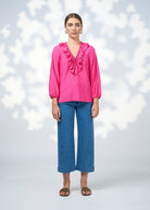 Floaty, blouse with a deep V neckline and a ruffled collar. Featuring a centre front tie at the bust to secure the neckline. Blouson sleeves gather into thin elasticated cuffs.