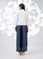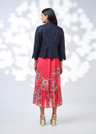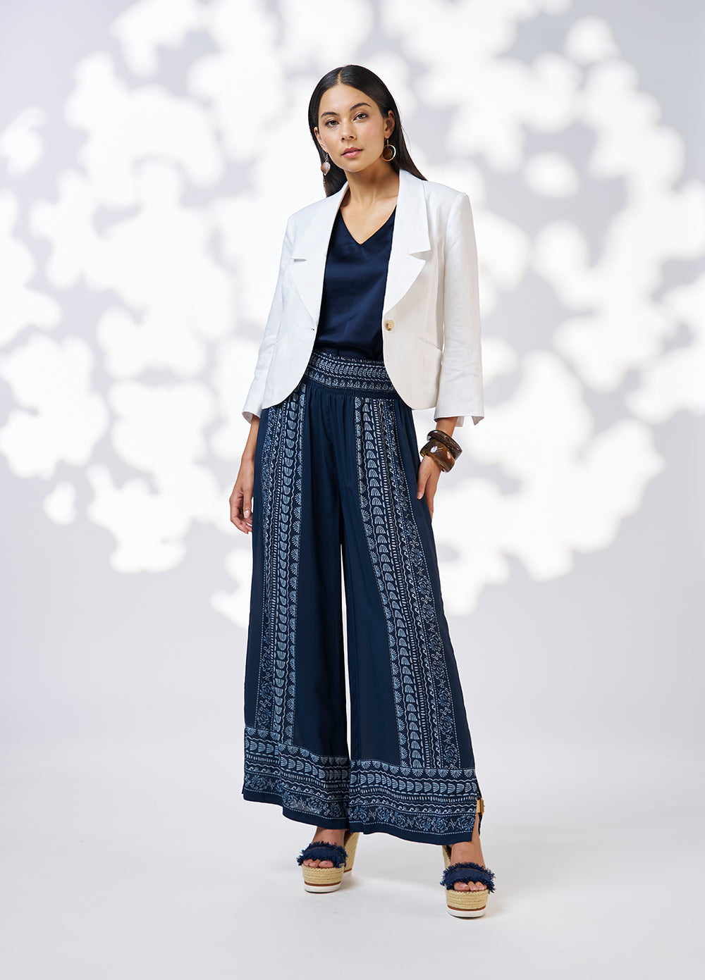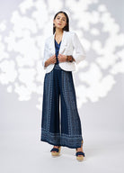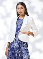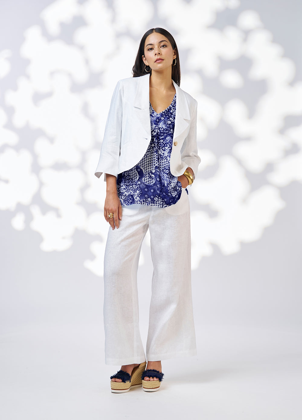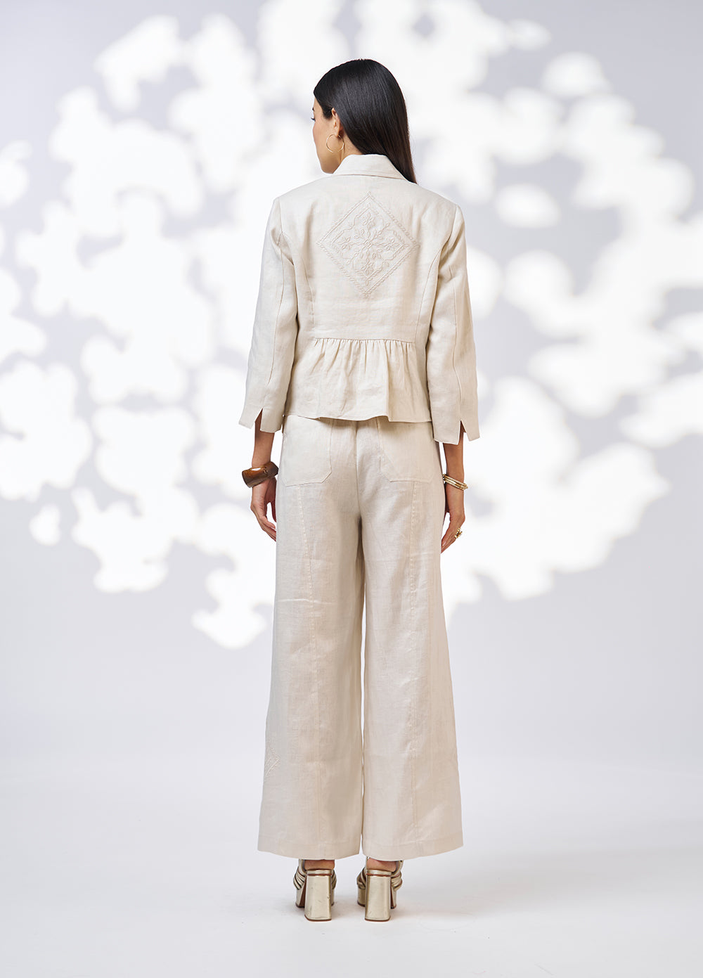 Cropped, linen jacket with a back peplum and rounded front hem. Statement embroidery adds detail and elevates the styling.