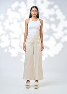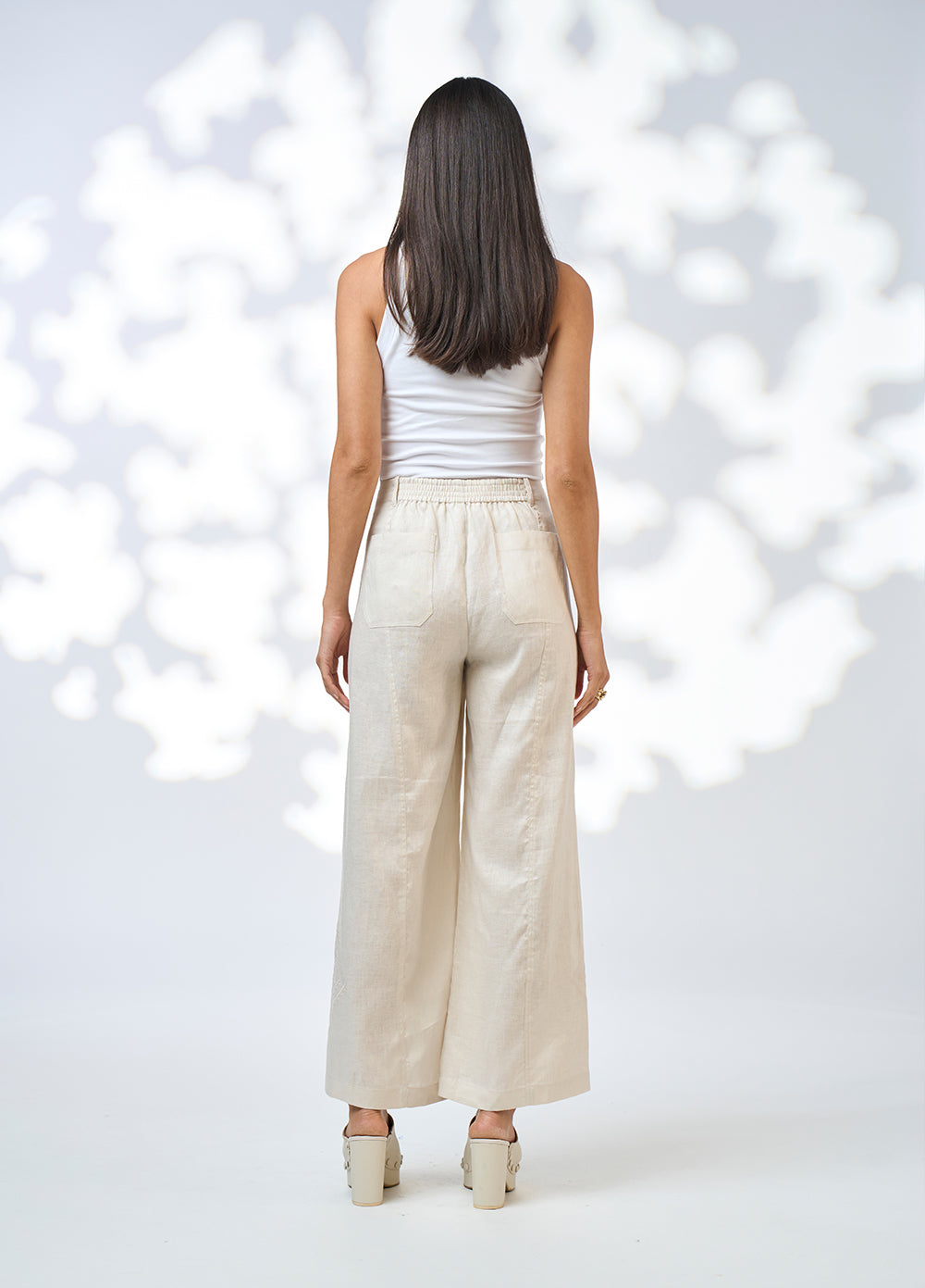 Wide leg, linen pant with a forward front seam and back elastic panel for a flattering fit. Features embroidery detailing down side of leg.