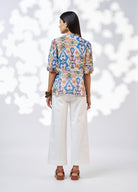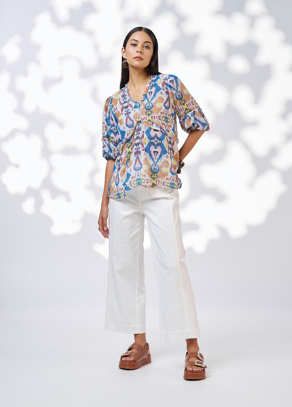 Printed top with a V-neckline and flattering under bust seams. Featuring raw edge trimming detail, and sleeves gather into elasticated cuffs.