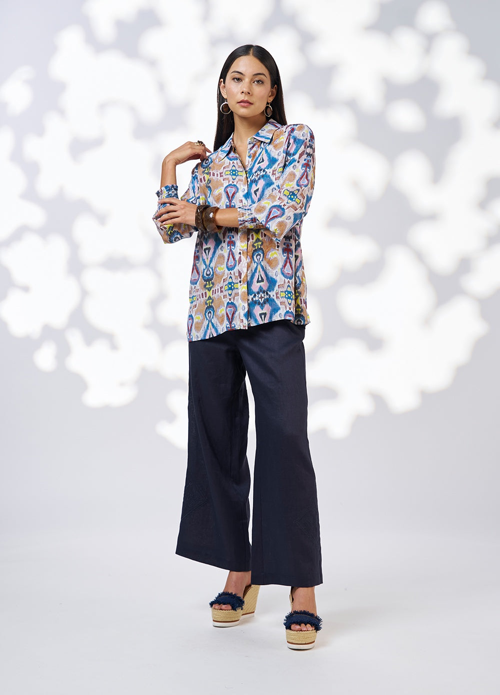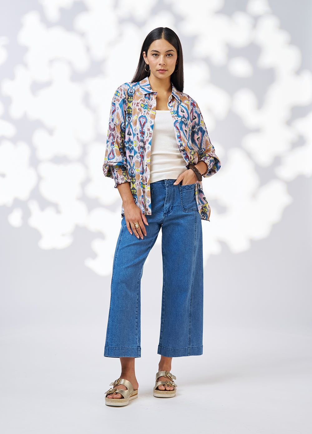 Button through collared shirt with a concealed button packet, featuring blouson sleeves with deep shirred cuffs and side splits.