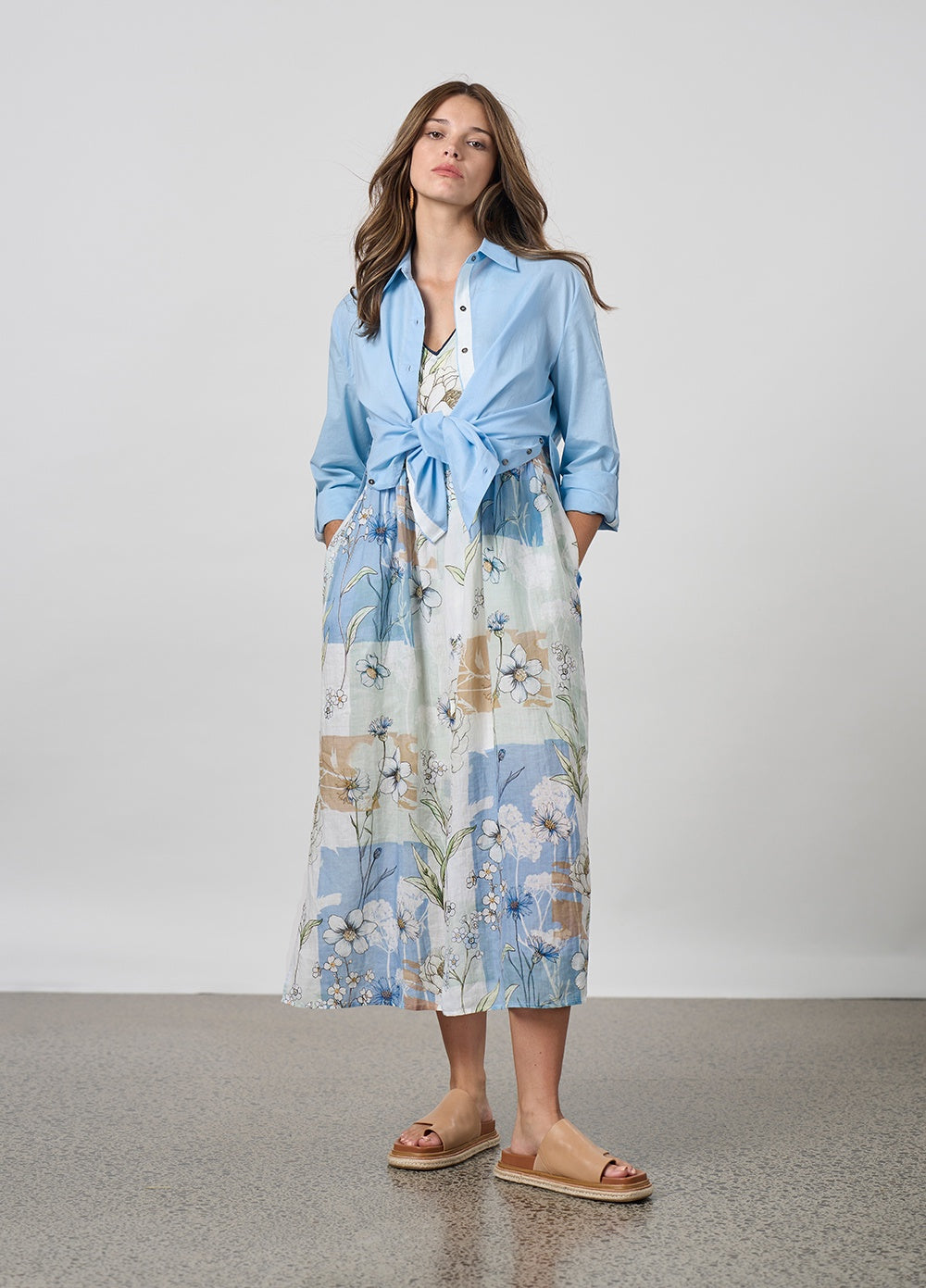 Button-through collared shirt with a tailed hem and contrast tape detailing. Featuring side button through plackets.