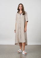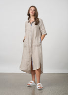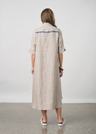Collared shirt dress with front and back yokes, stitched down pockets and a tailed hem. With 3/4 length sleeves featuring an overarm split on the cuff.
