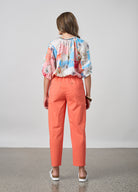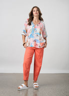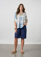 Printed top with a gathered neckline which can open up to a V. Sleeves gather into turned back elasticated cuffs and side splits allow for ease.