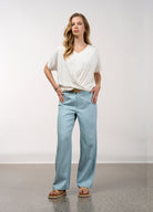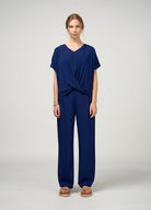 A relaxed fitting top with a flattering V neckline, with grown on sleeves. Featuring a draped twist detail at the front hem.