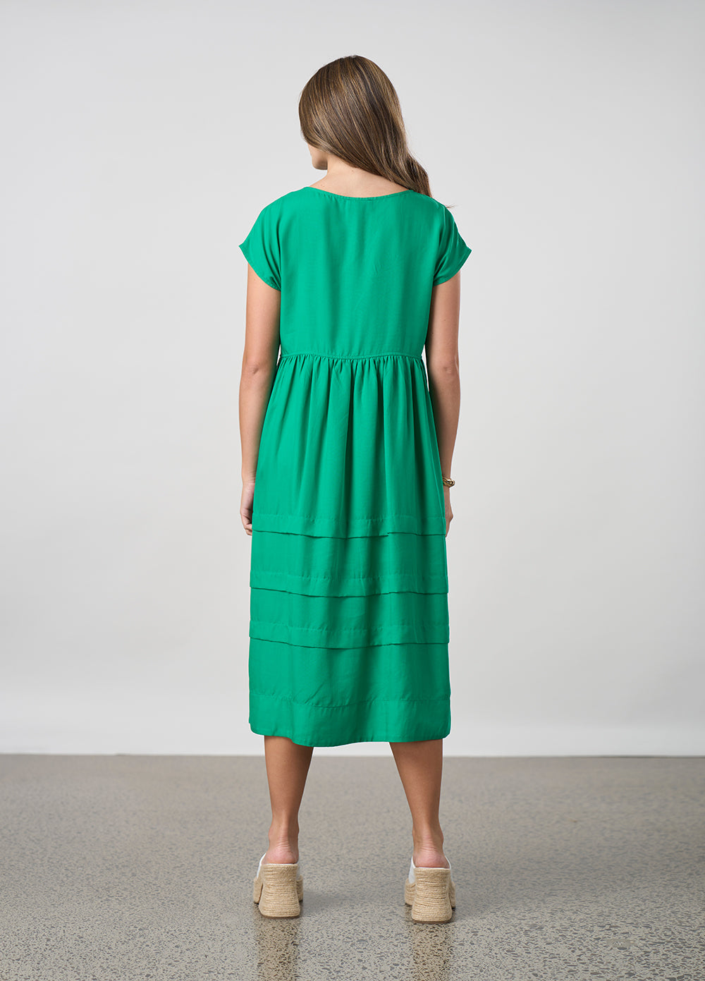 Lightweight dress with a gathered skirt at waist seam and bust darts for a flattering fit. Featuring vertical tucks on the bodice and horizontal tucks on the skirt to add detail. Lined.