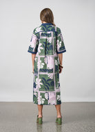 Relaxed fitting V-neck dress with contrast detail on the collar, placket, sleeve hem and side split panels for added detail. Featuring stitched down pockets and deep side splits.