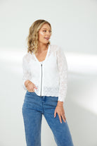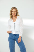 100% Cotton lightweight cropped knitted cardigan. Double ended zipper. Cardigan is knitted with a triangle pointelle pattern with a scalloped body hem and sleeve cuffs.