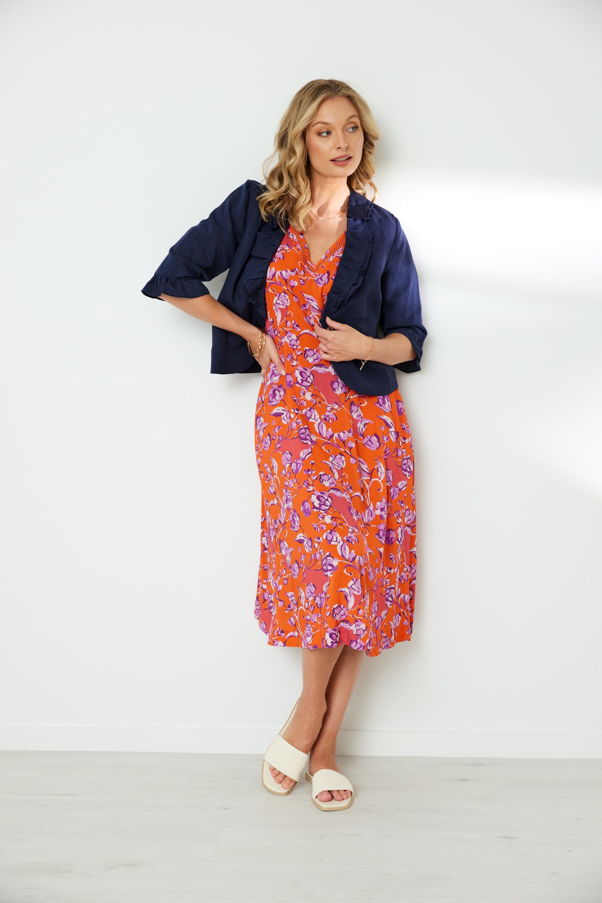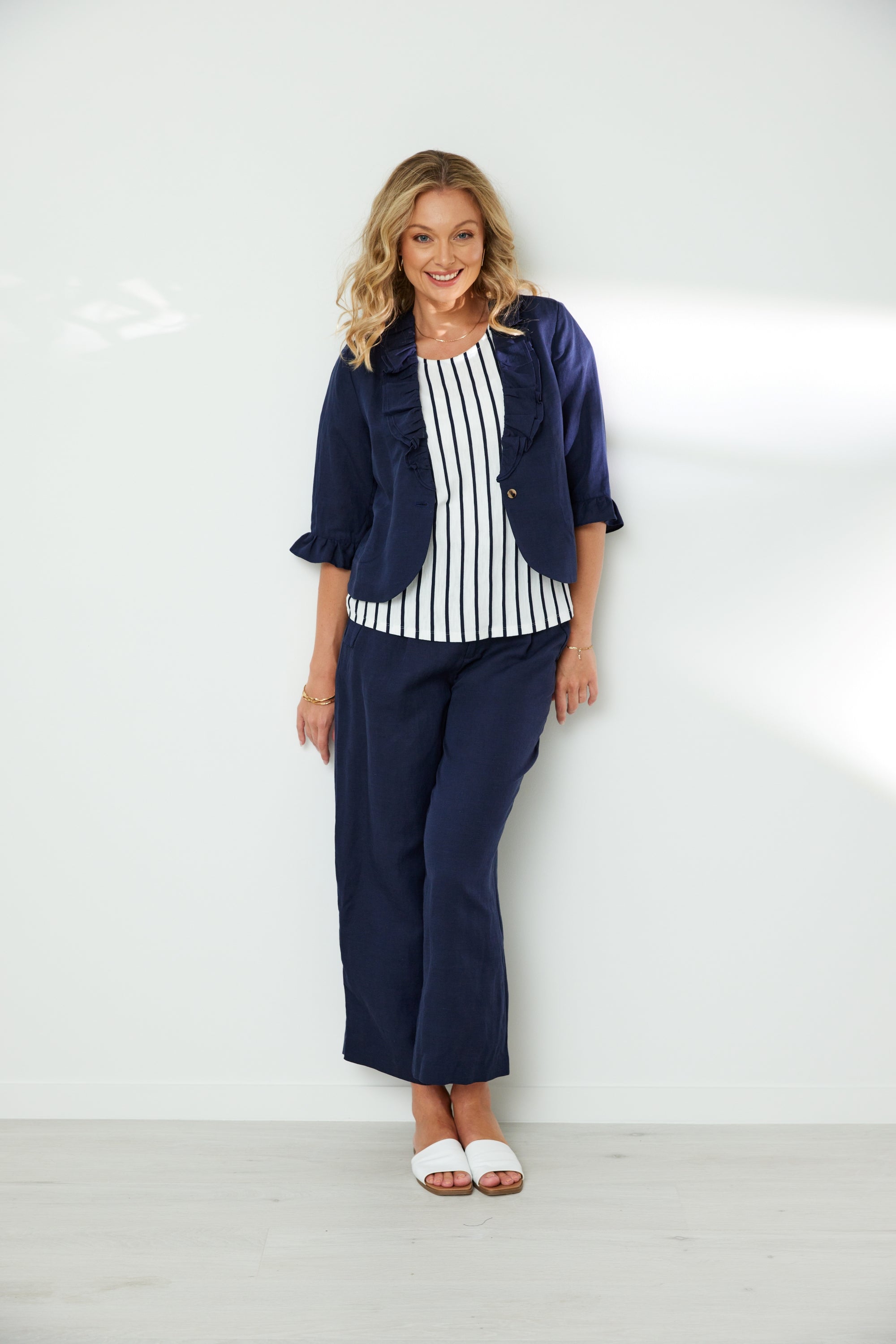 Unlined, cropped Tencel/Linen blend jacket with single button closure. Mid length sleeves with frill cuff. Double frill detail at front opening.