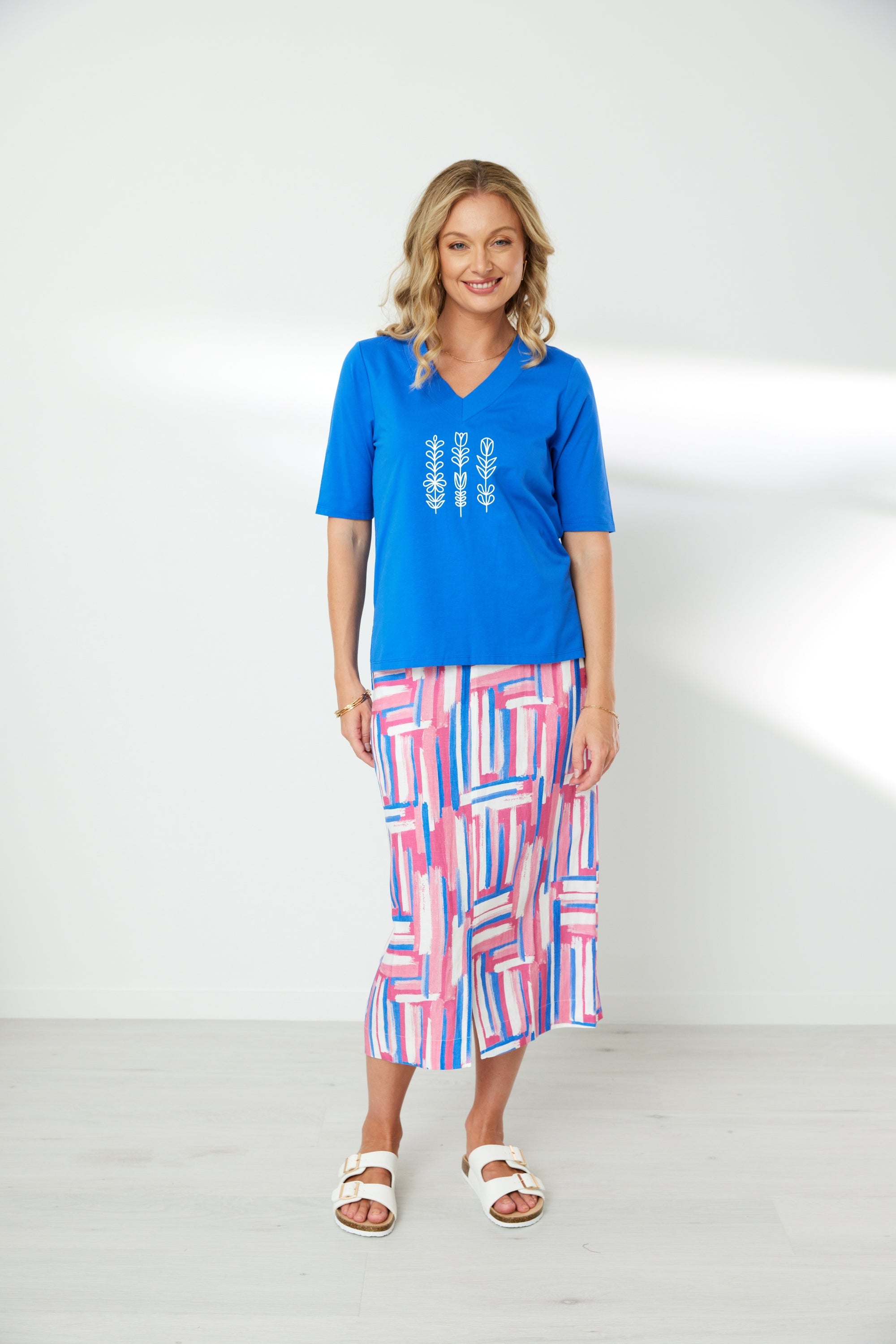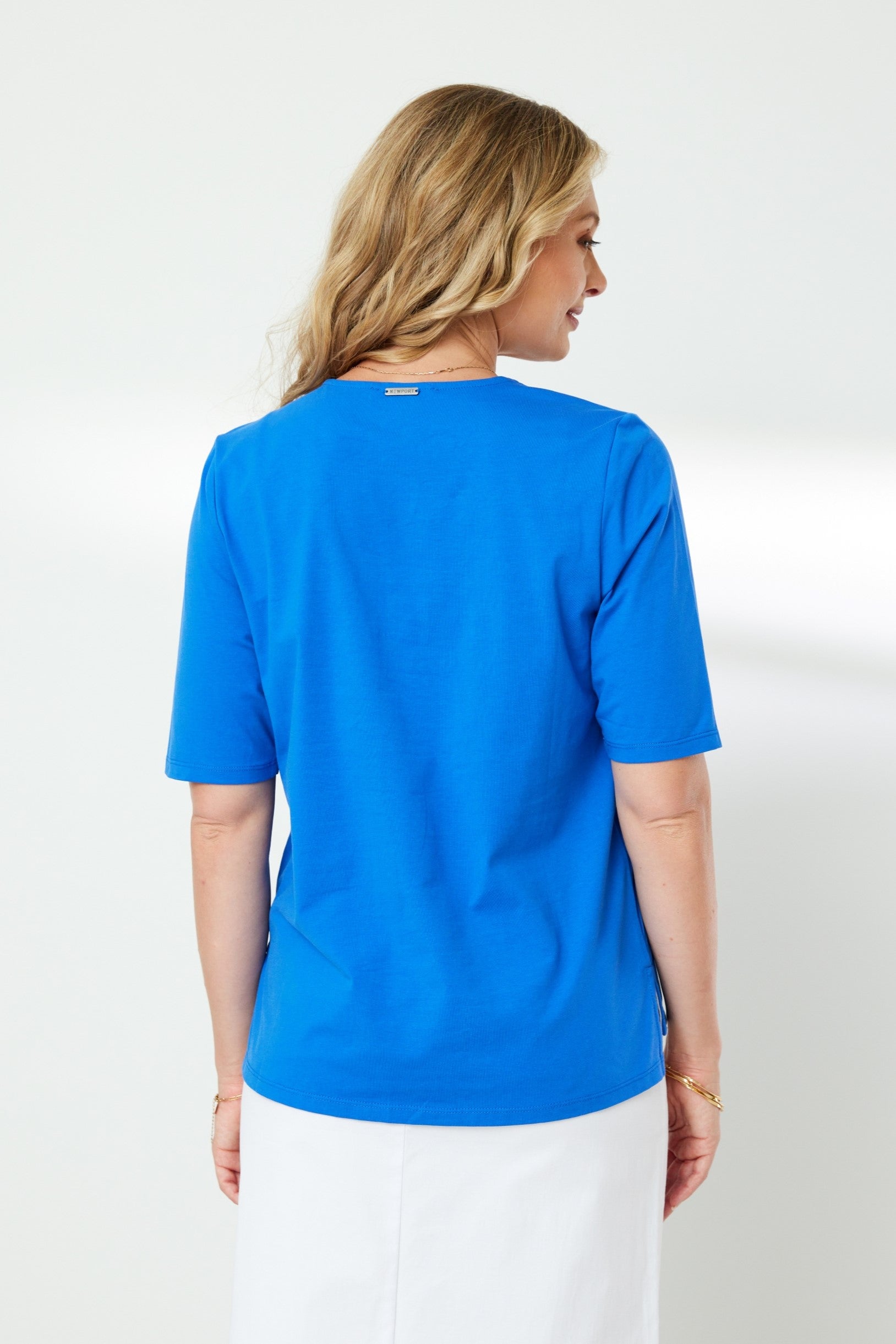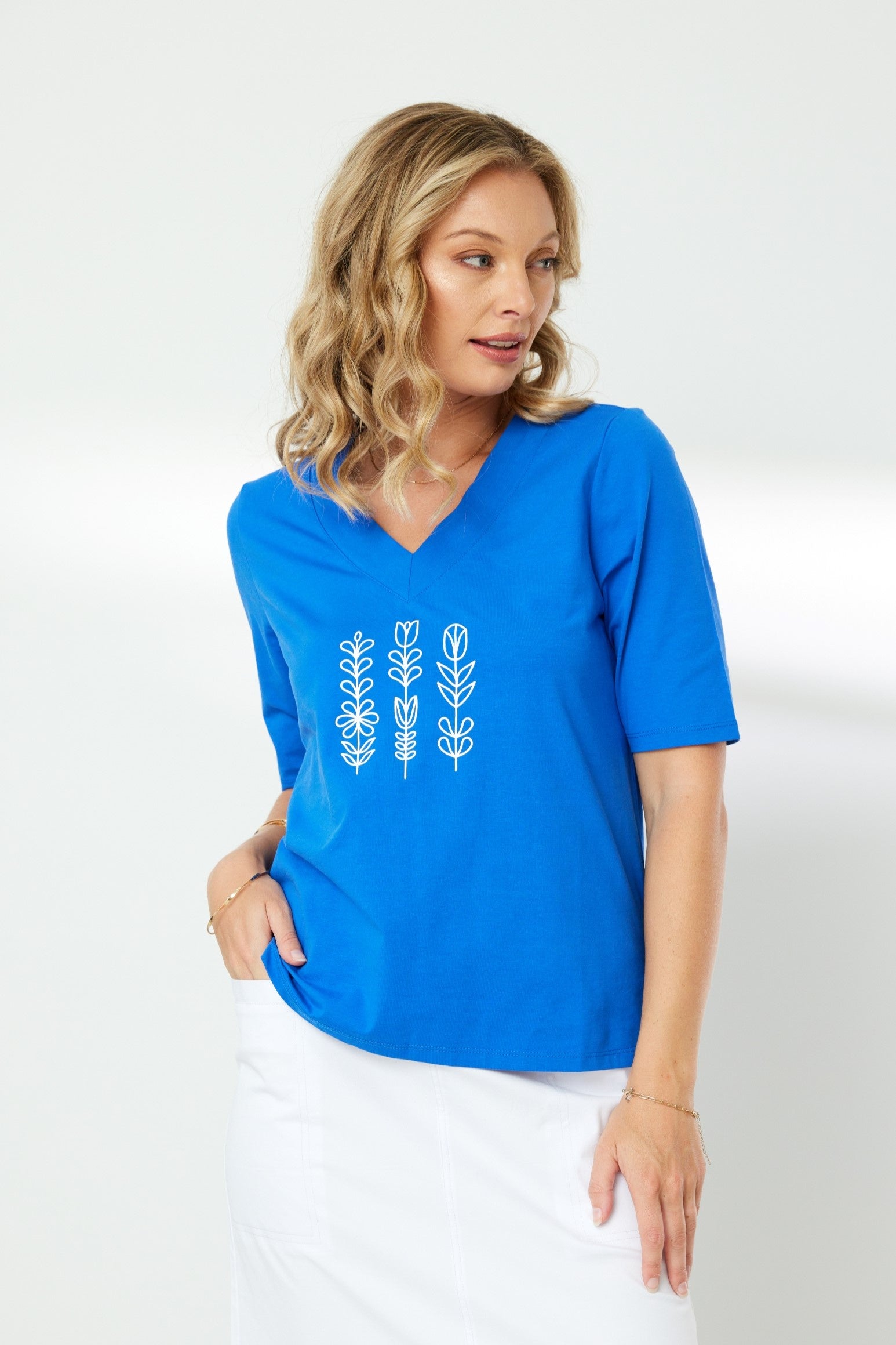 Set in sleeve t-shirt with wide V neck band. Placement print at front chest. Side splits with contrast tape detail.