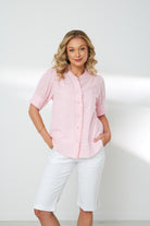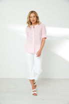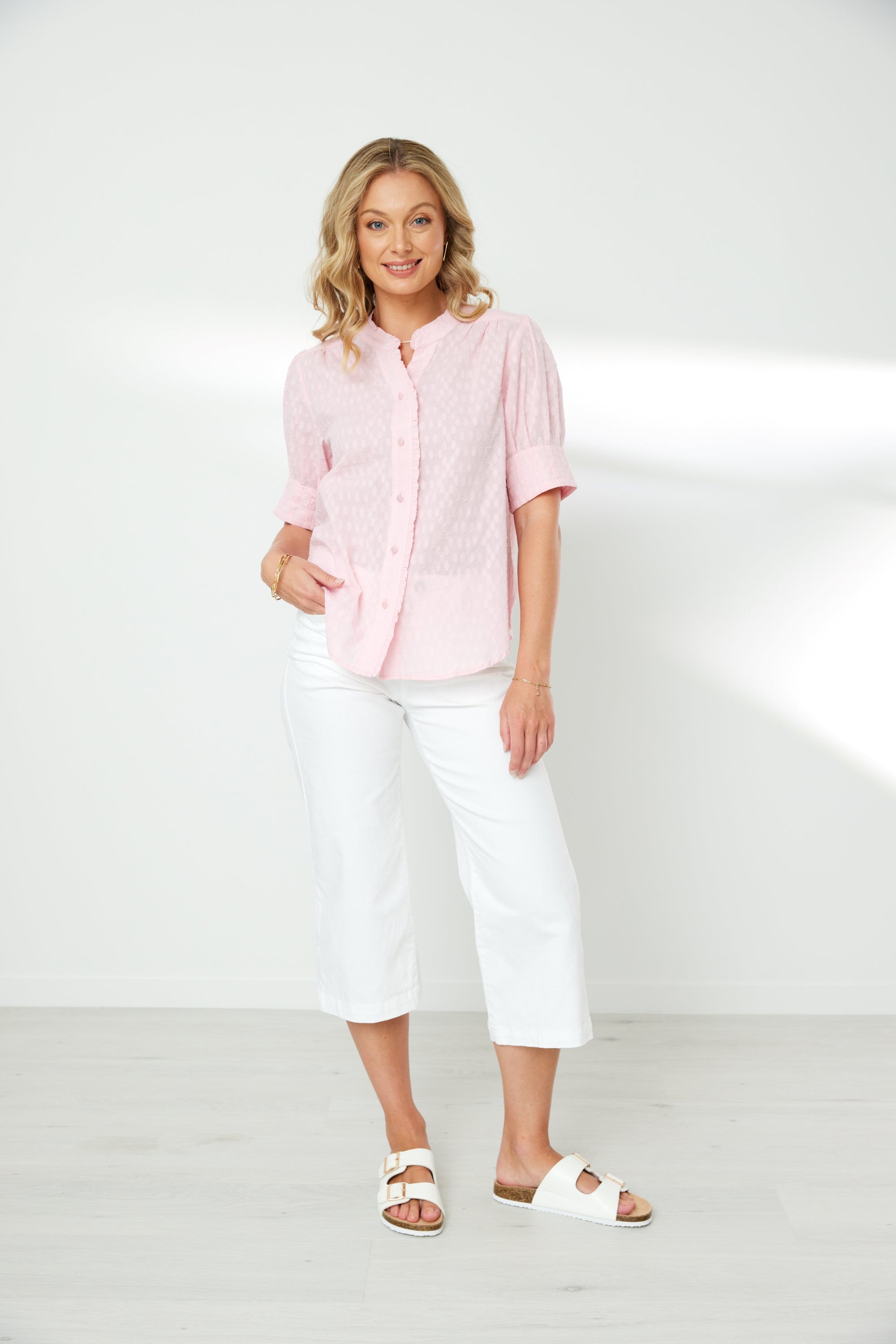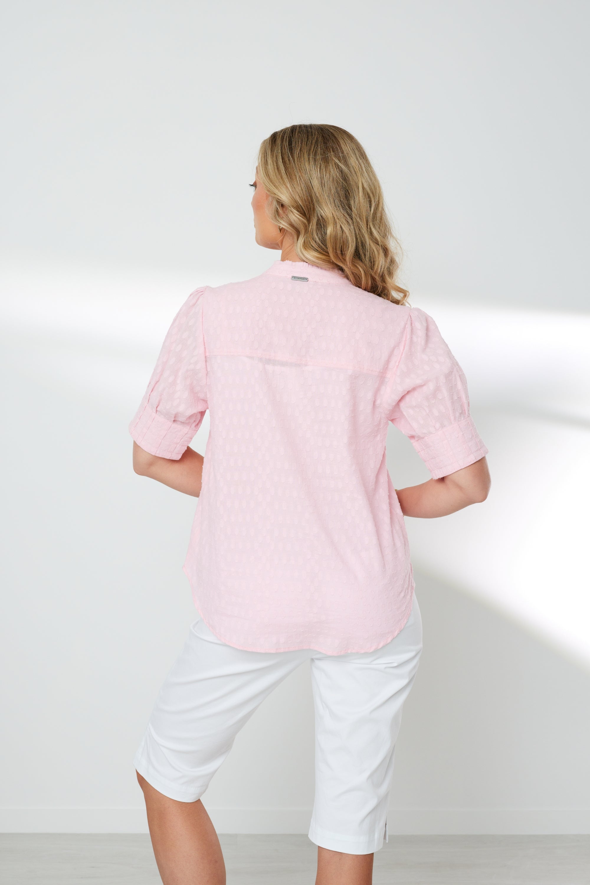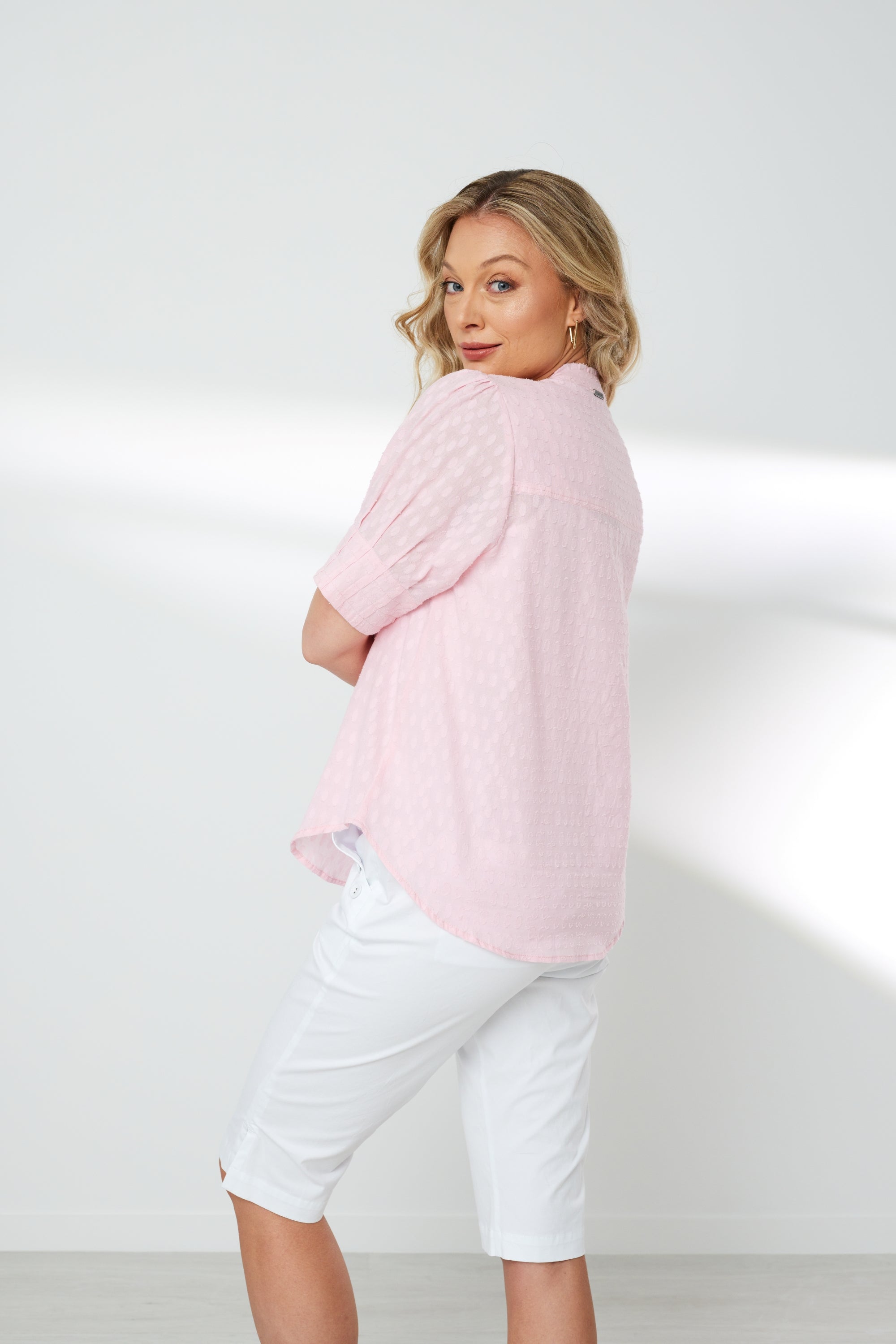 Soft cotton textured blouse available in two soft pastel summer colours. Mandarin collar with small frill detail that continues onto the front button placket. Curved shirt hem. Short sleeves with pleat detail at cuffs. Back yoke.
