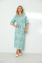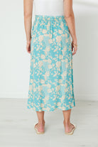 Soft viscose printed skirt with flat front & elasticated back waistband. Front waistband has cotton braid tie with tassel detail. Side splits at hem.