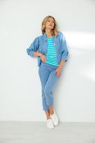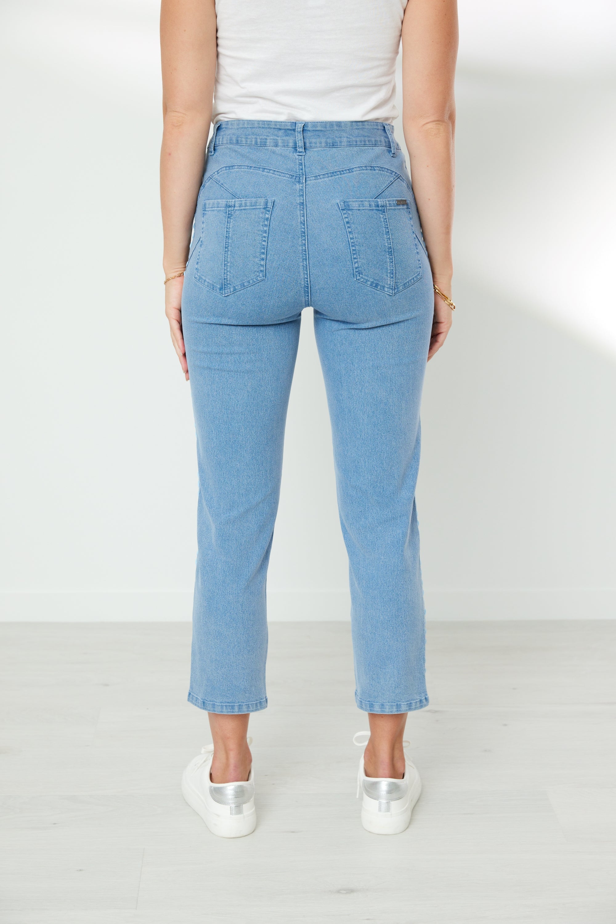 Button and fly front stretch denim jean. 5 pocket styling. Contrast ric rac trim at side seam. Belt loops at waistband with shaped back yoke seam with dart detail. 7/8 length.