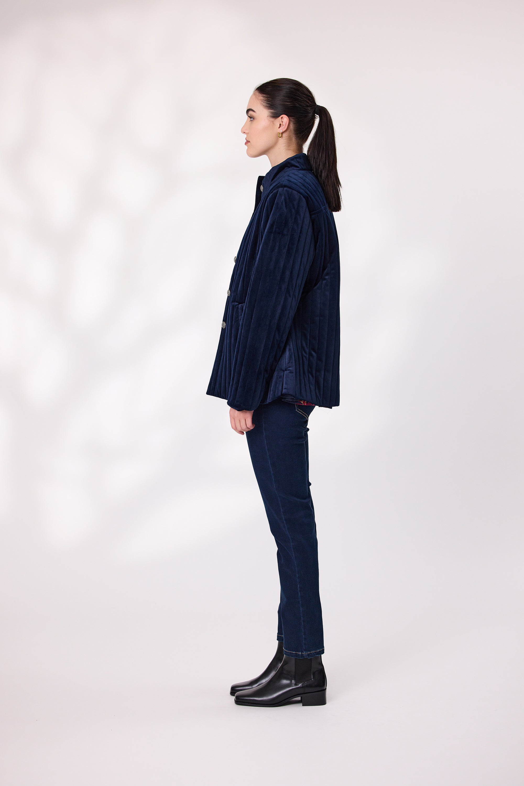 Elevate your outerwear with this quilted velvet jacket, designed for comfort and sophistication. Featuring a soft velvet finish, full lining, classic button-up front and front pockets. The structured collar and quilted texture add timeless appeal. Ideal for cool-weather styling.