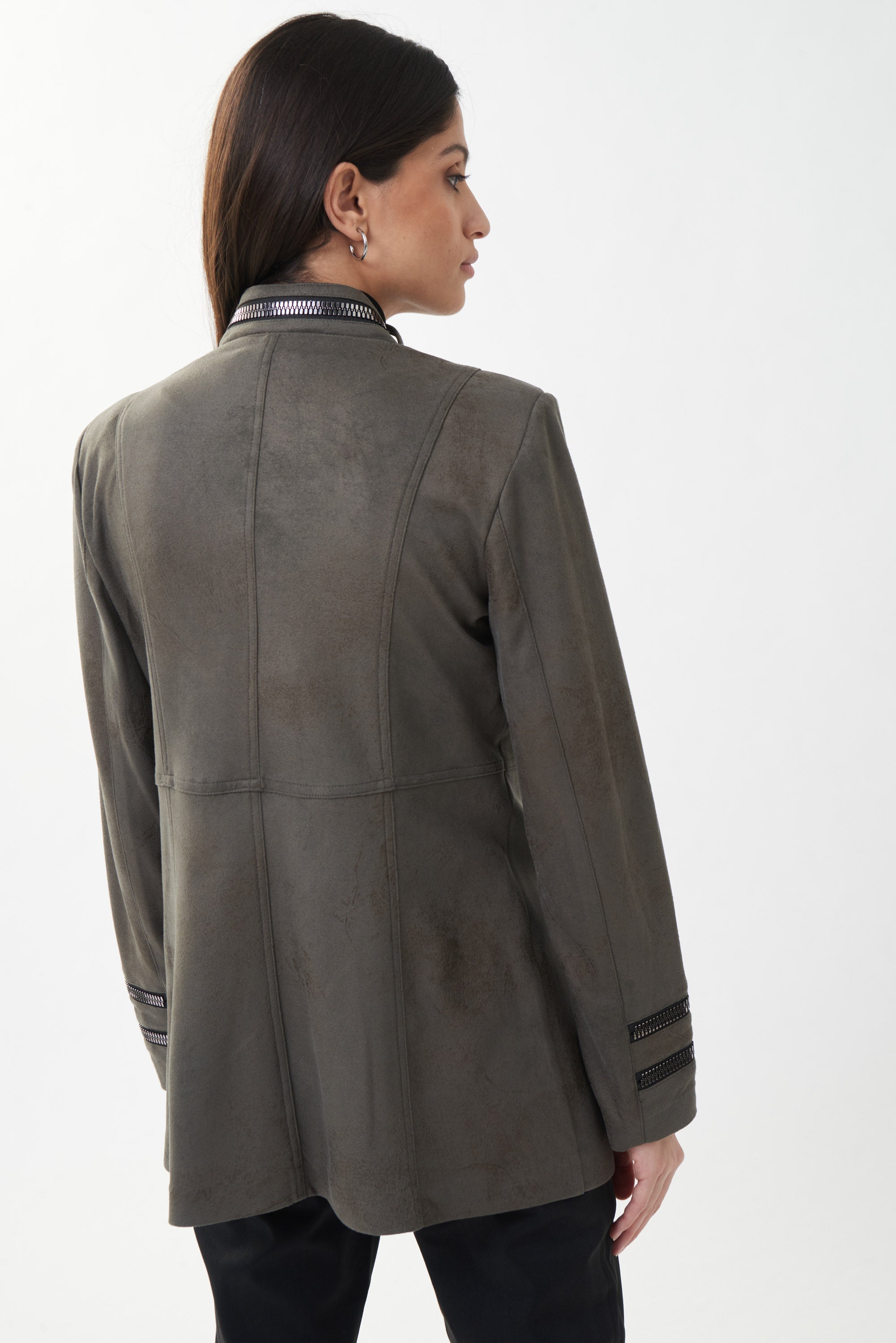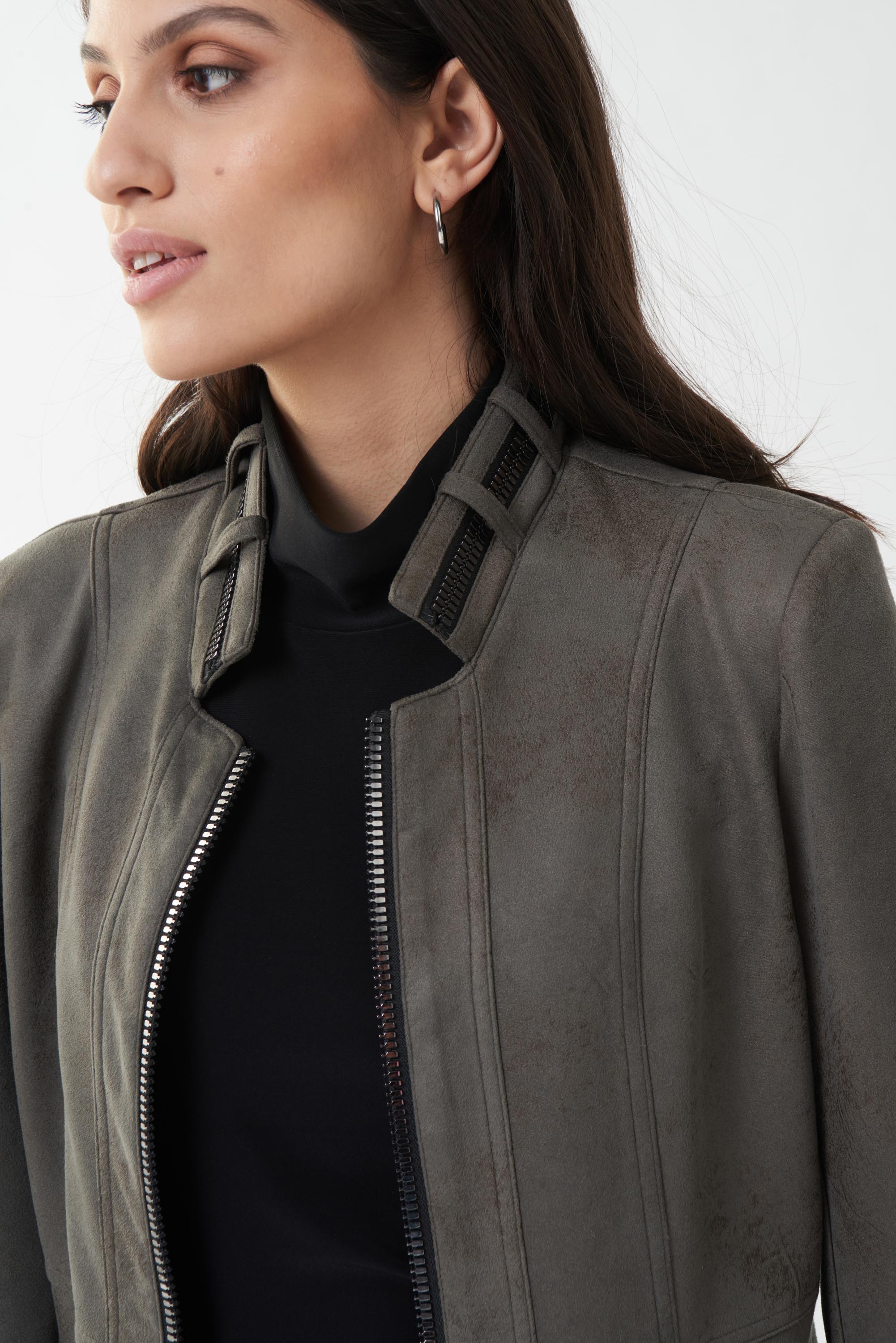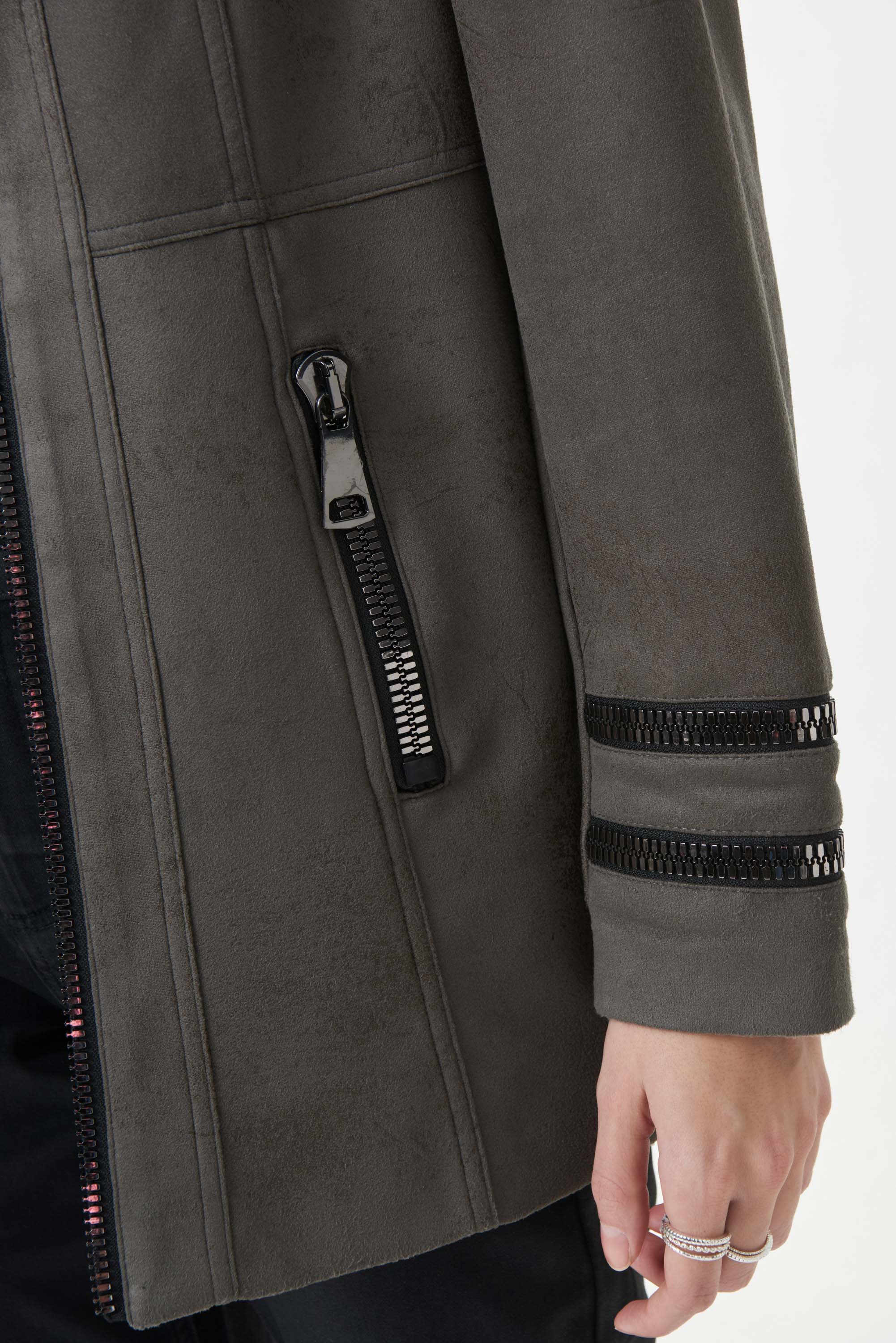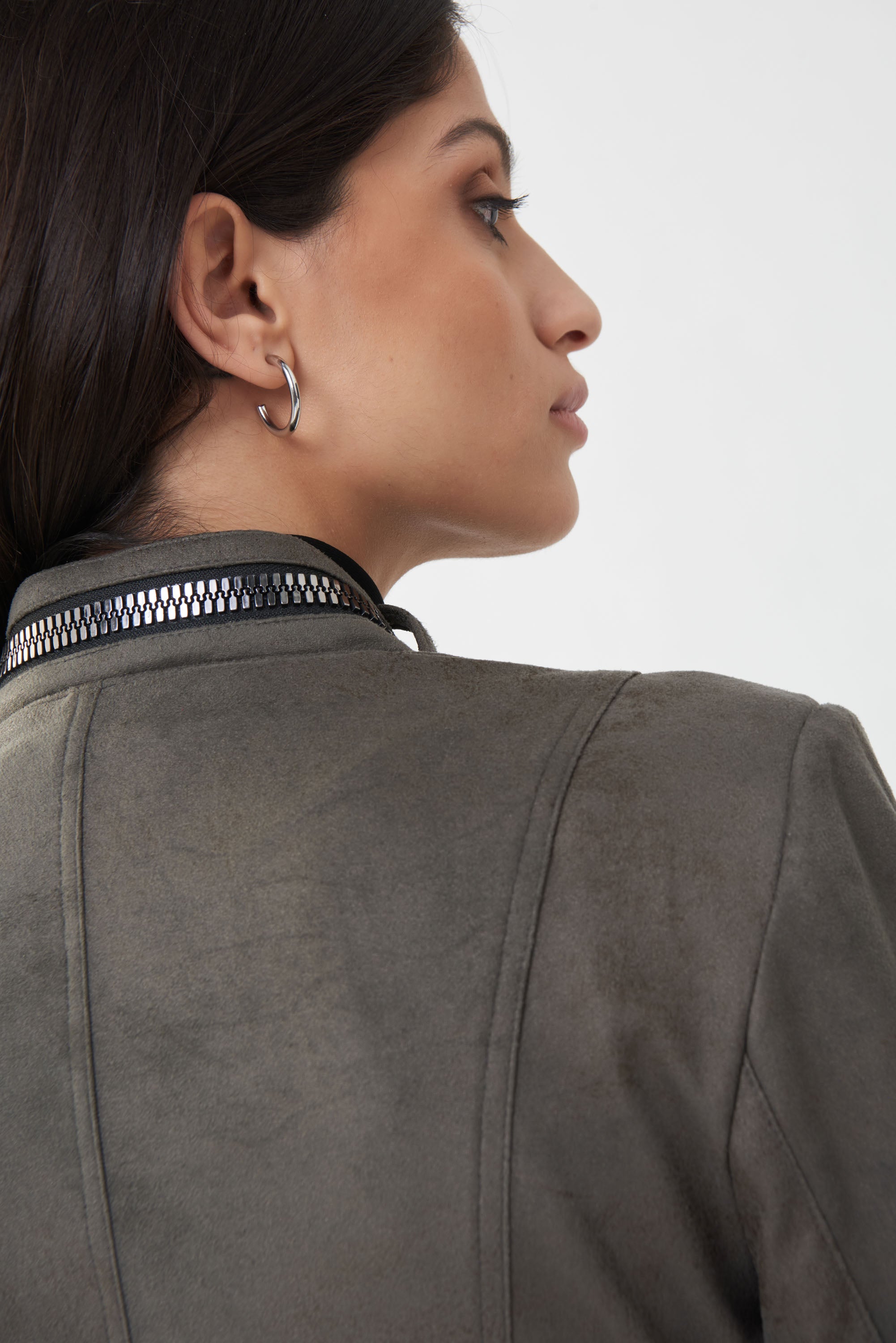 This sporty yet elegant jacket is well-poised to be an indispensable wardrobe staple. With a straight fit, this piece offers structure without compromising on function. Faux suede fabric offers an excellent feel that is hard to match. Metallic zippers pull the look together, and a stand collar provides a tailored touch.