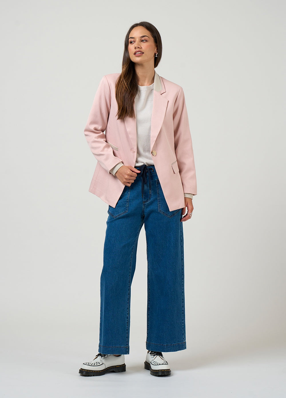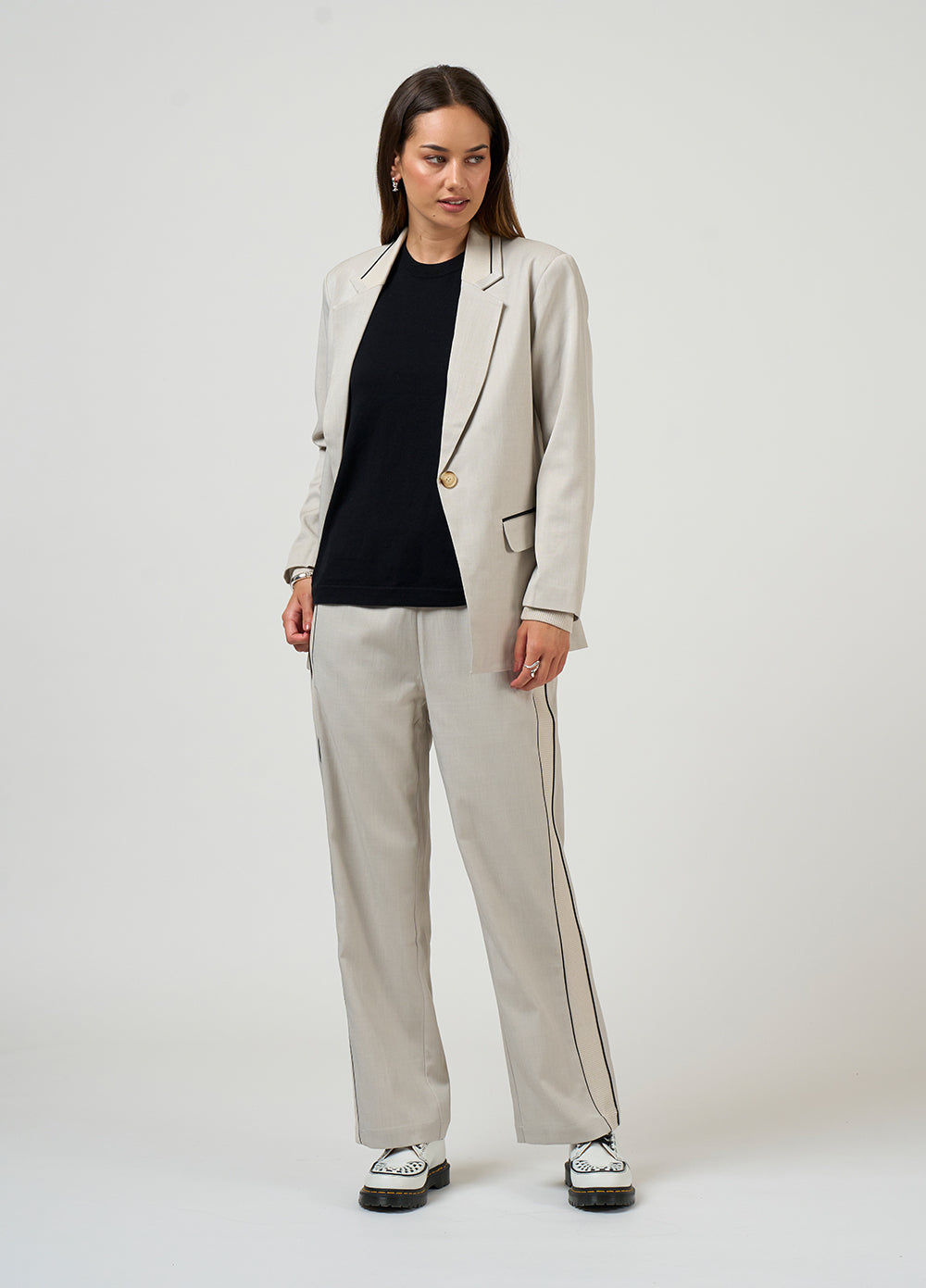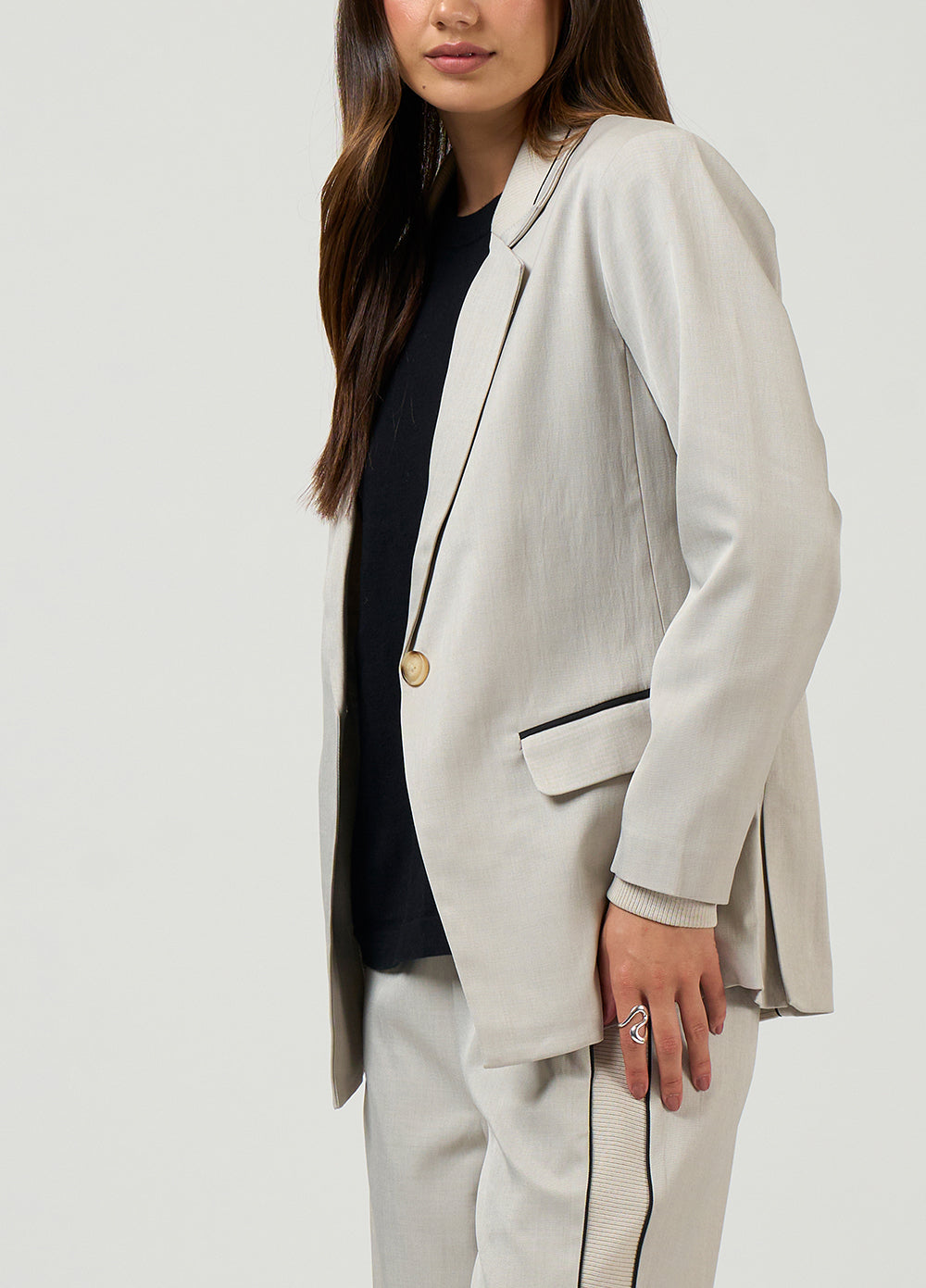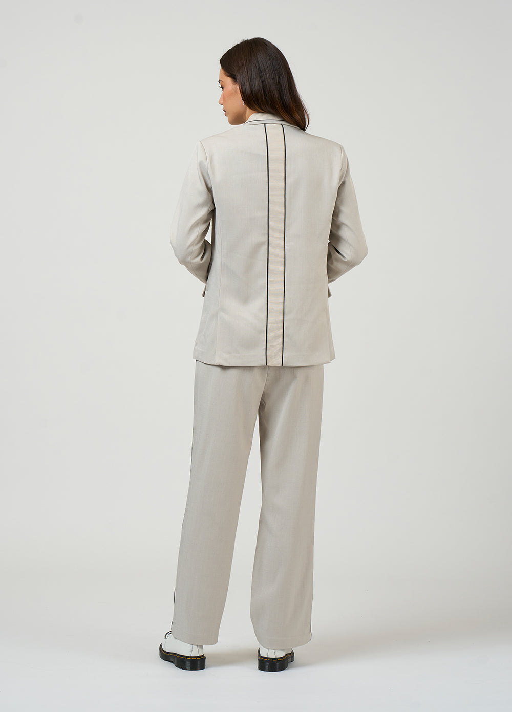 Relaxed tailored jacket featuring rib insert panels at collar, center back, pockets and internal cuffs,  with fine contrast insert piping and functional pockets. Fully lined.