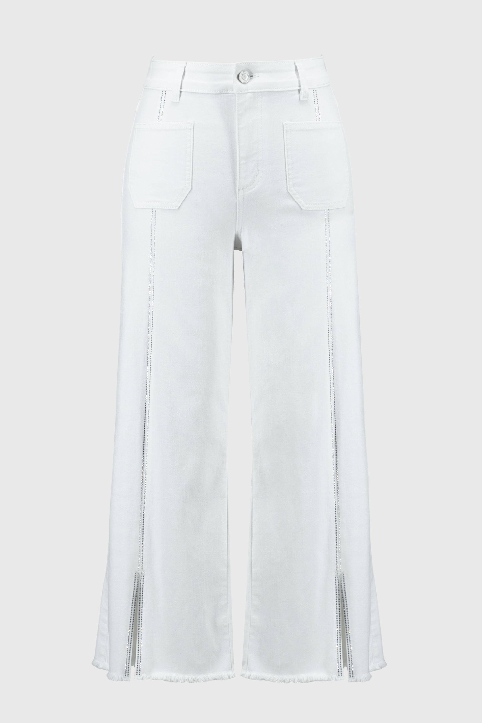 Revamp your wardrobe with these gorgeous culotte jeans. These stylish jeans feature four practical pockets and an embellished front seam that screams sophistication. The slit and frayed hem add a trendy edge to the design, making these pants an absolute must-have.