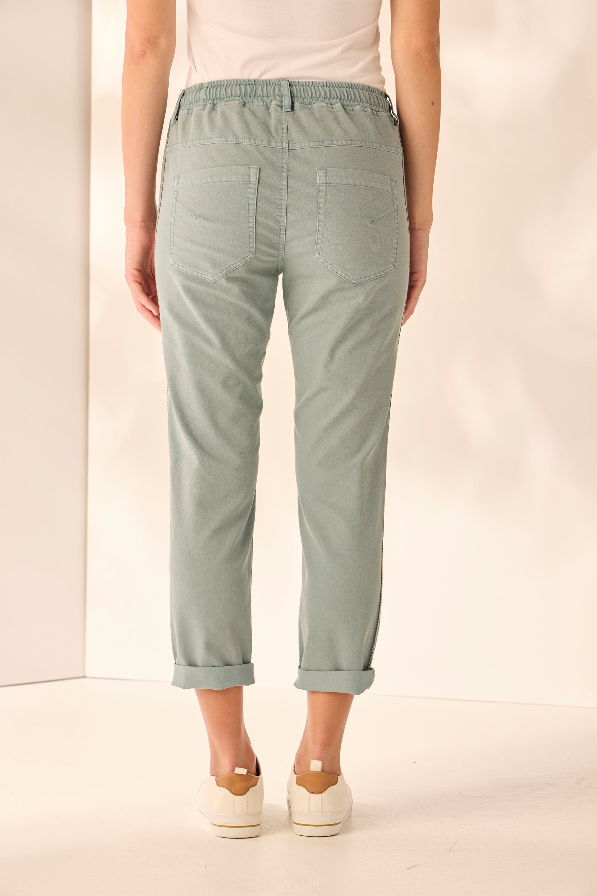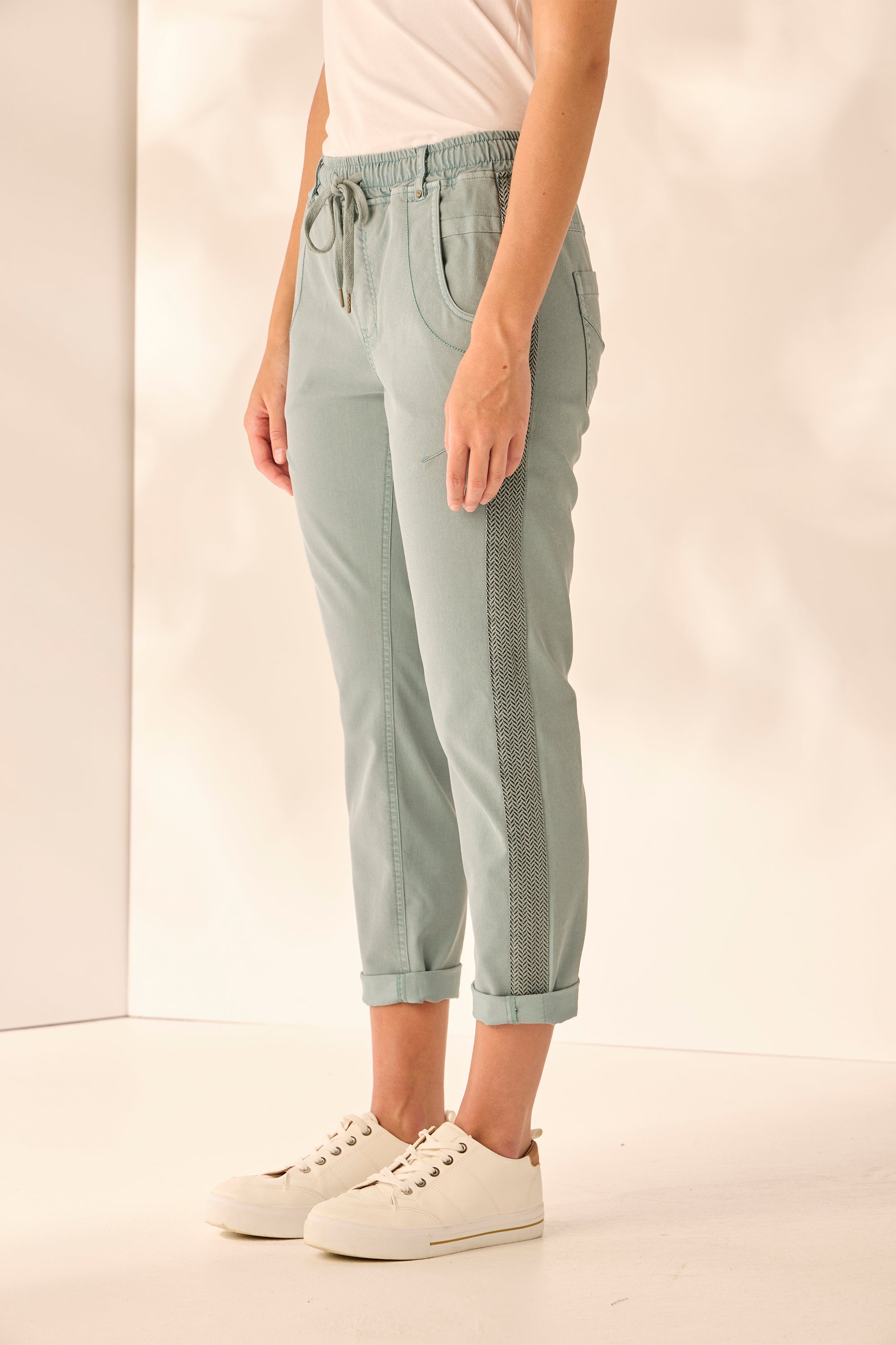 Casual jeans with an elasticated waist and adjustable drawstring tie. Soft handle and distressed finish are created by special garment wash.