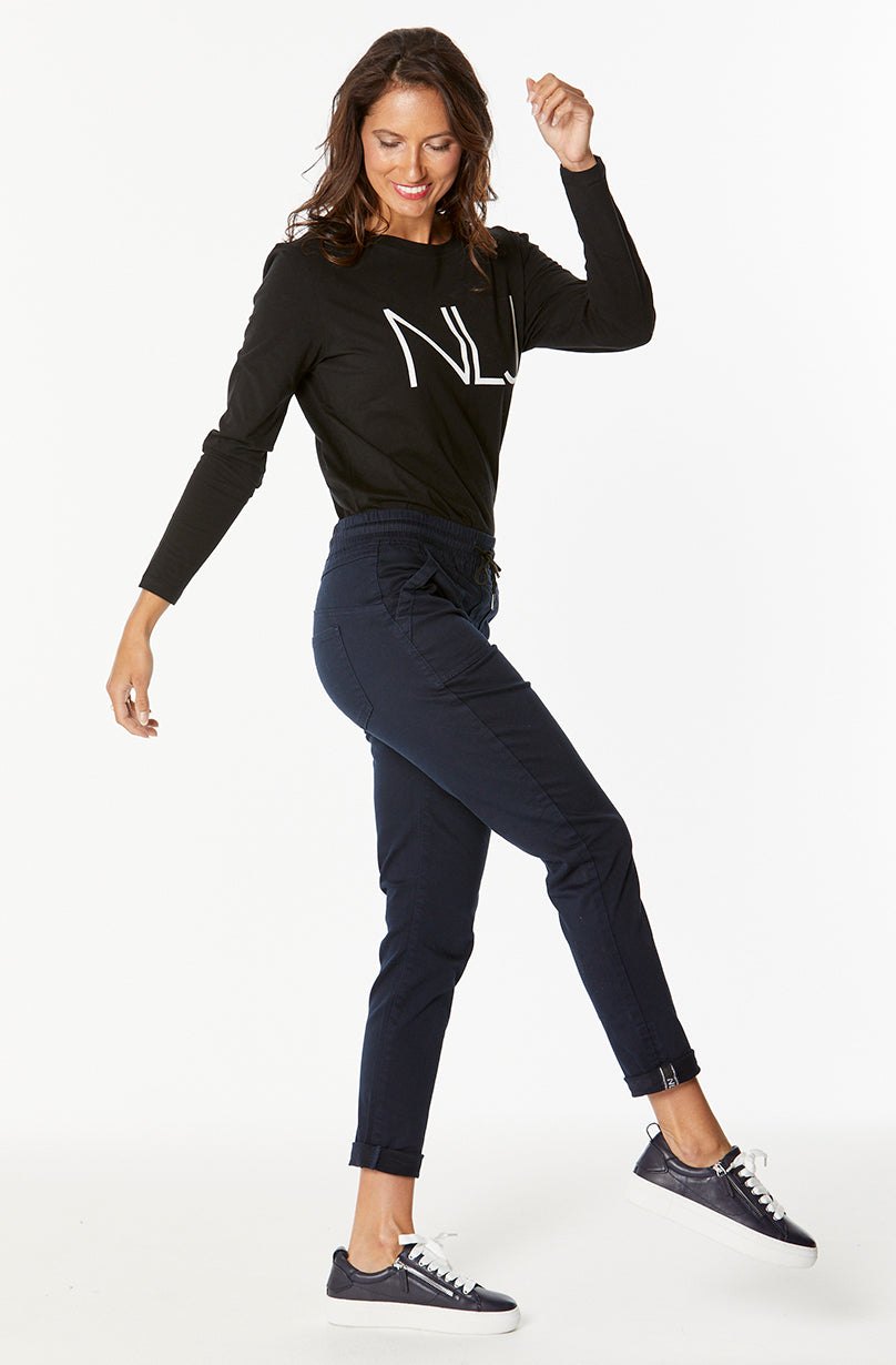 - 97% Cotton 3% Spandex - On trend soft handle comfy trakky style. Mid-rise (29cm) and 29inch length leg with a cool black and white New London jean tab at bottom hem.