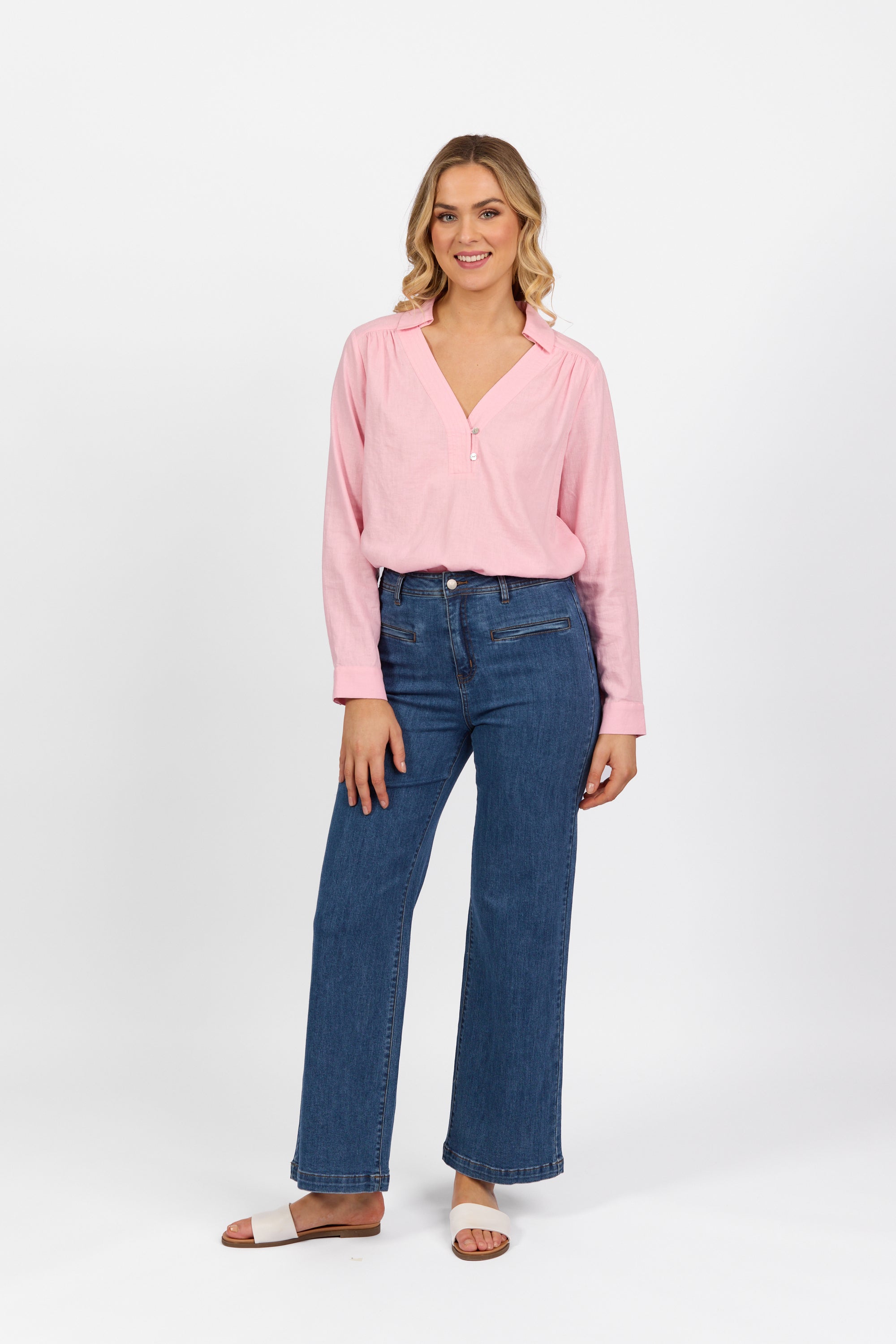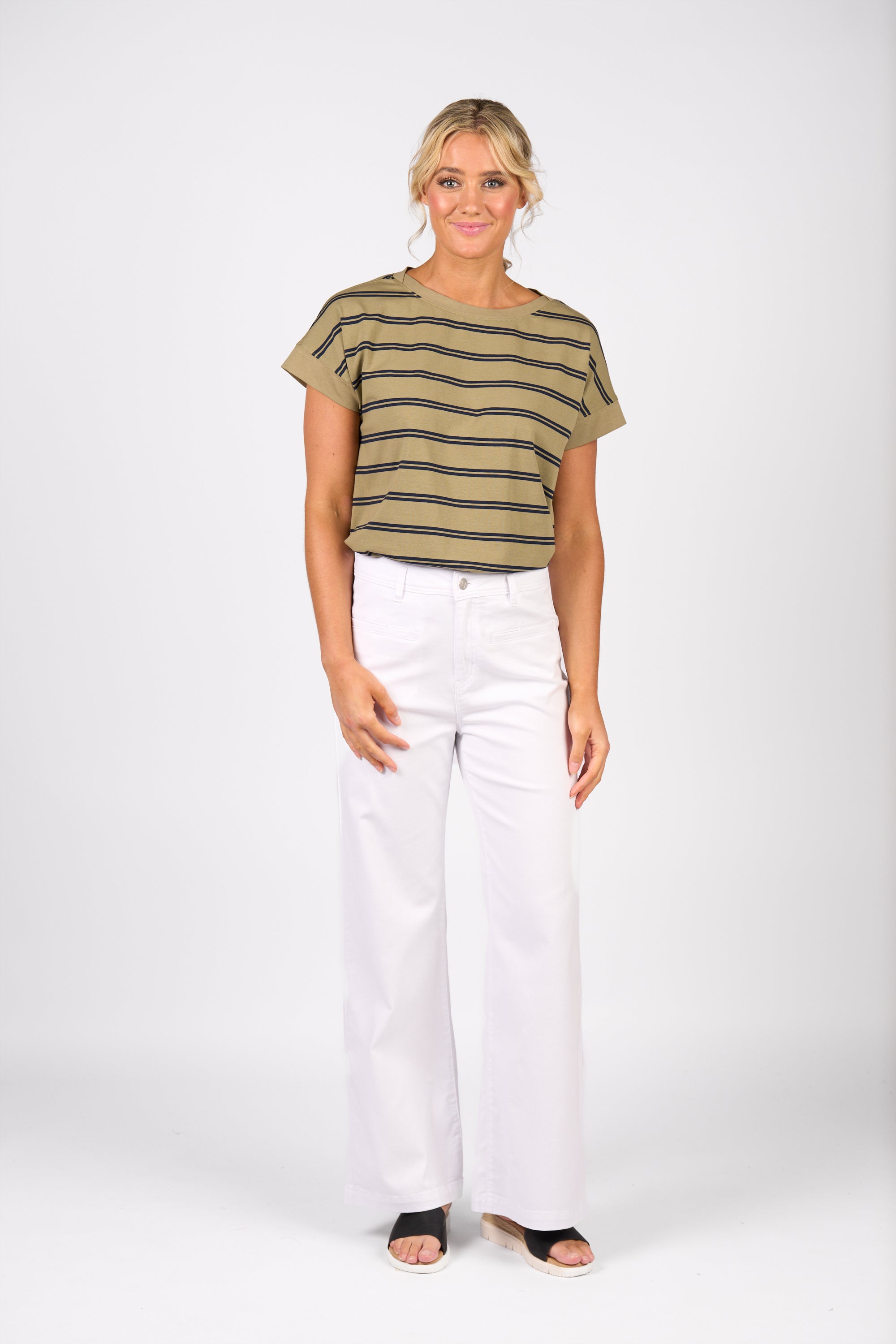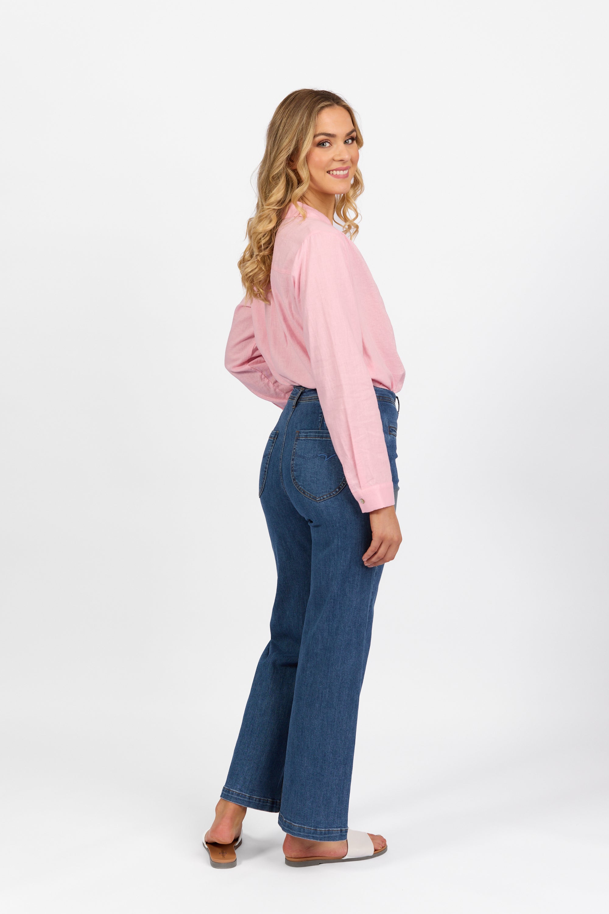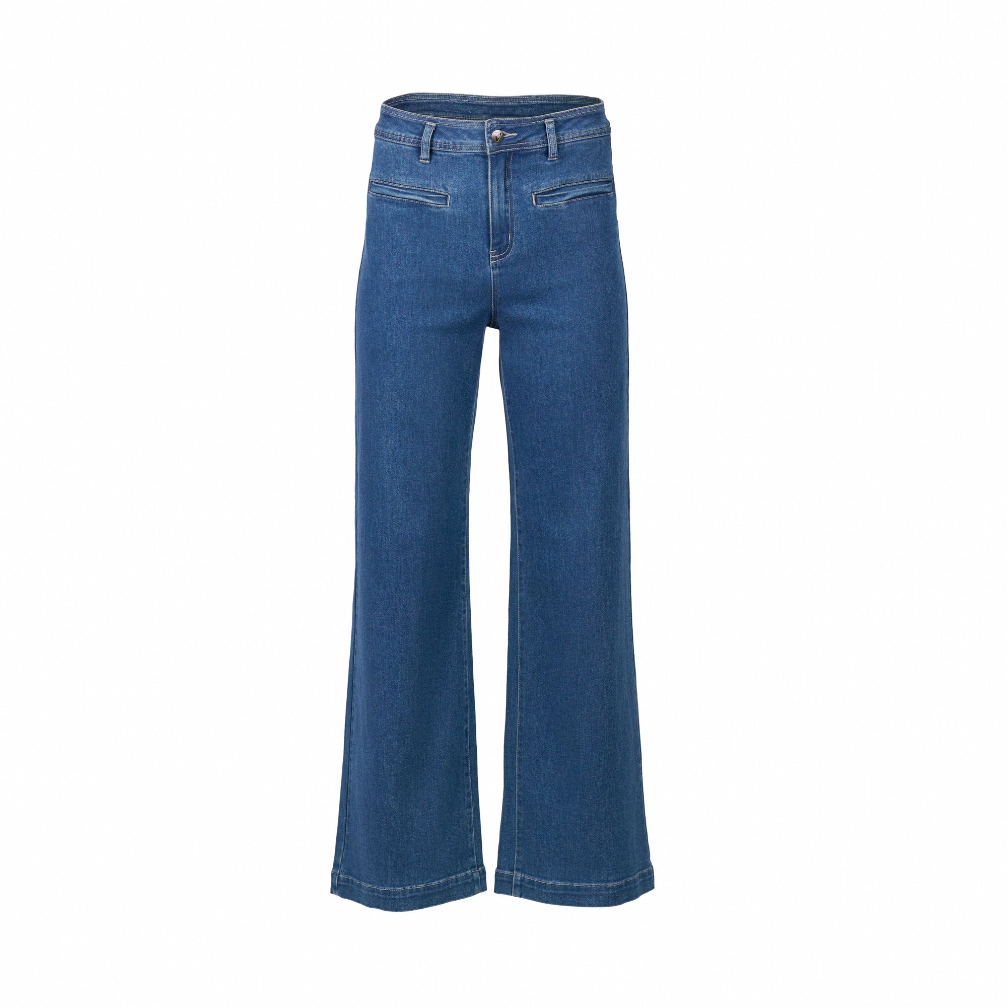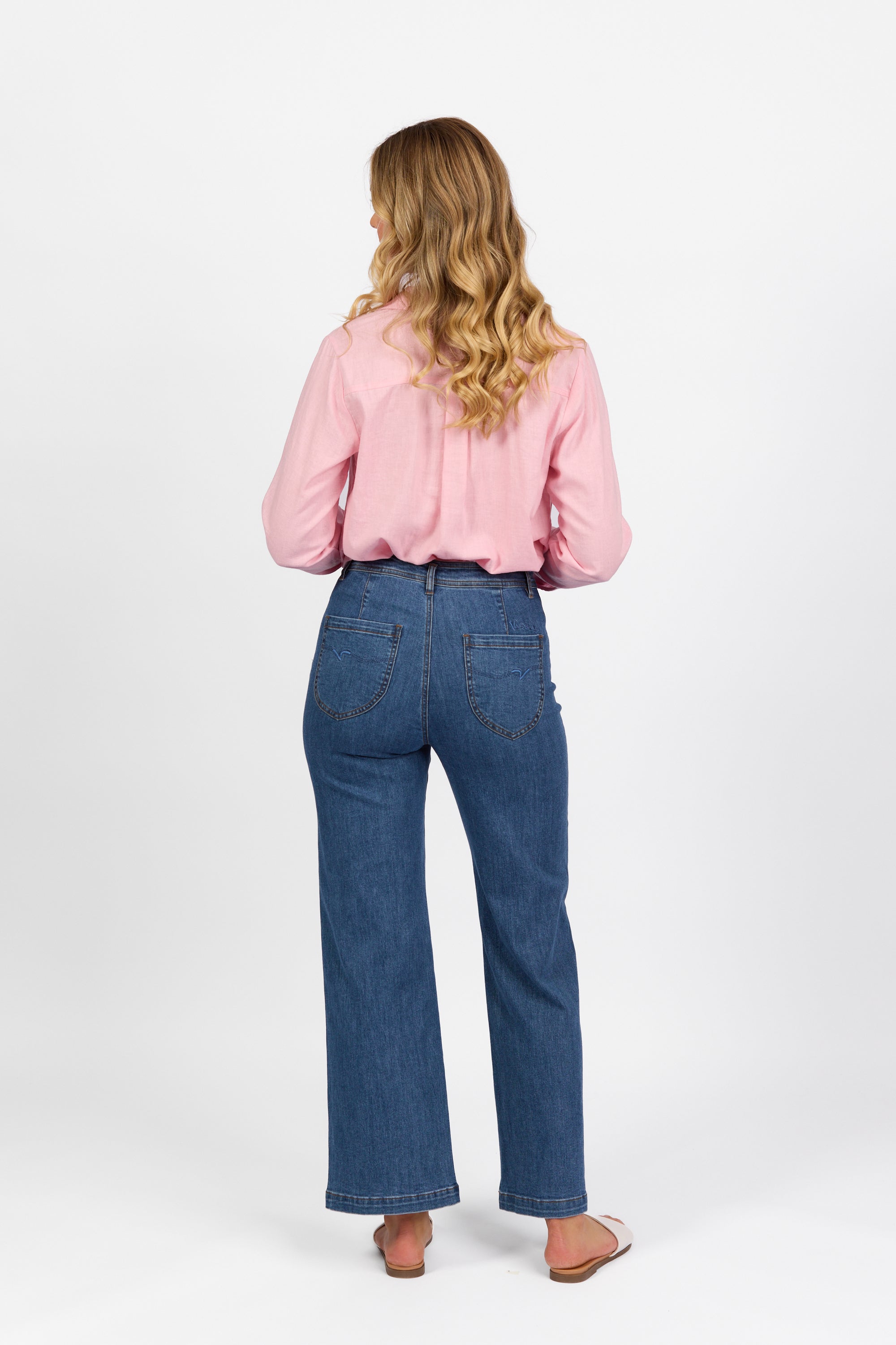 These wide-leg, full-length white jeans are made from a stretch denim fabric for a comfortable, flattering fit. They feature a zip fly, jean button closure, two front welt pockets, and two back patch pockets.