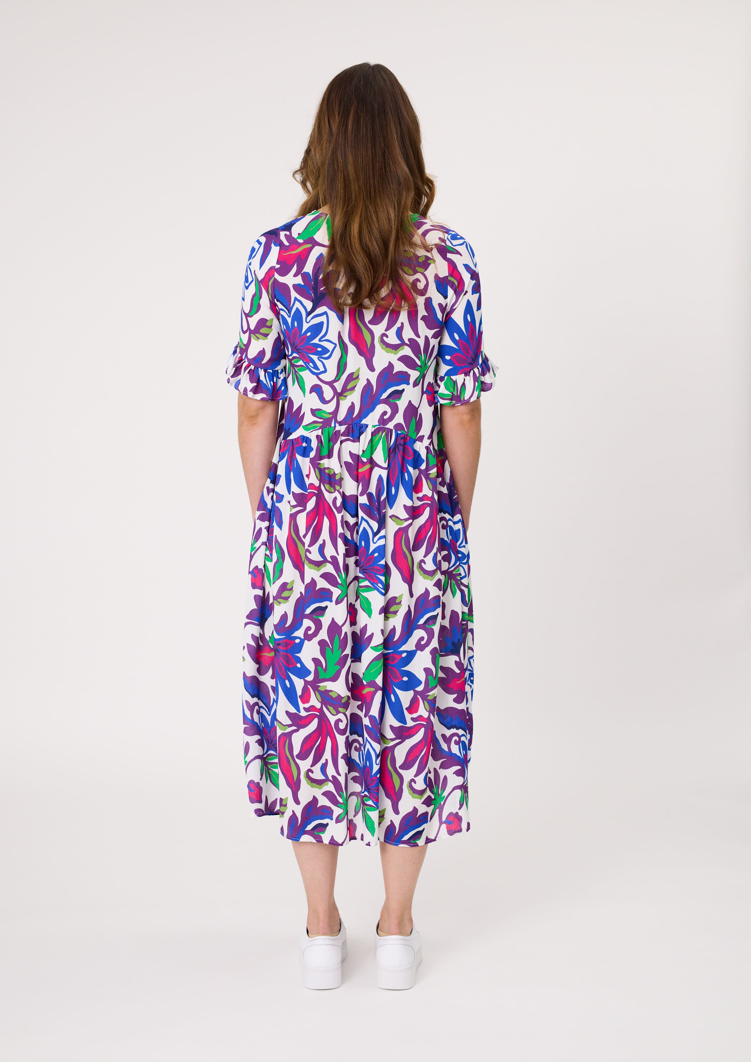 • Bold floral print in shades of blue, green, purple, and fuchsia.