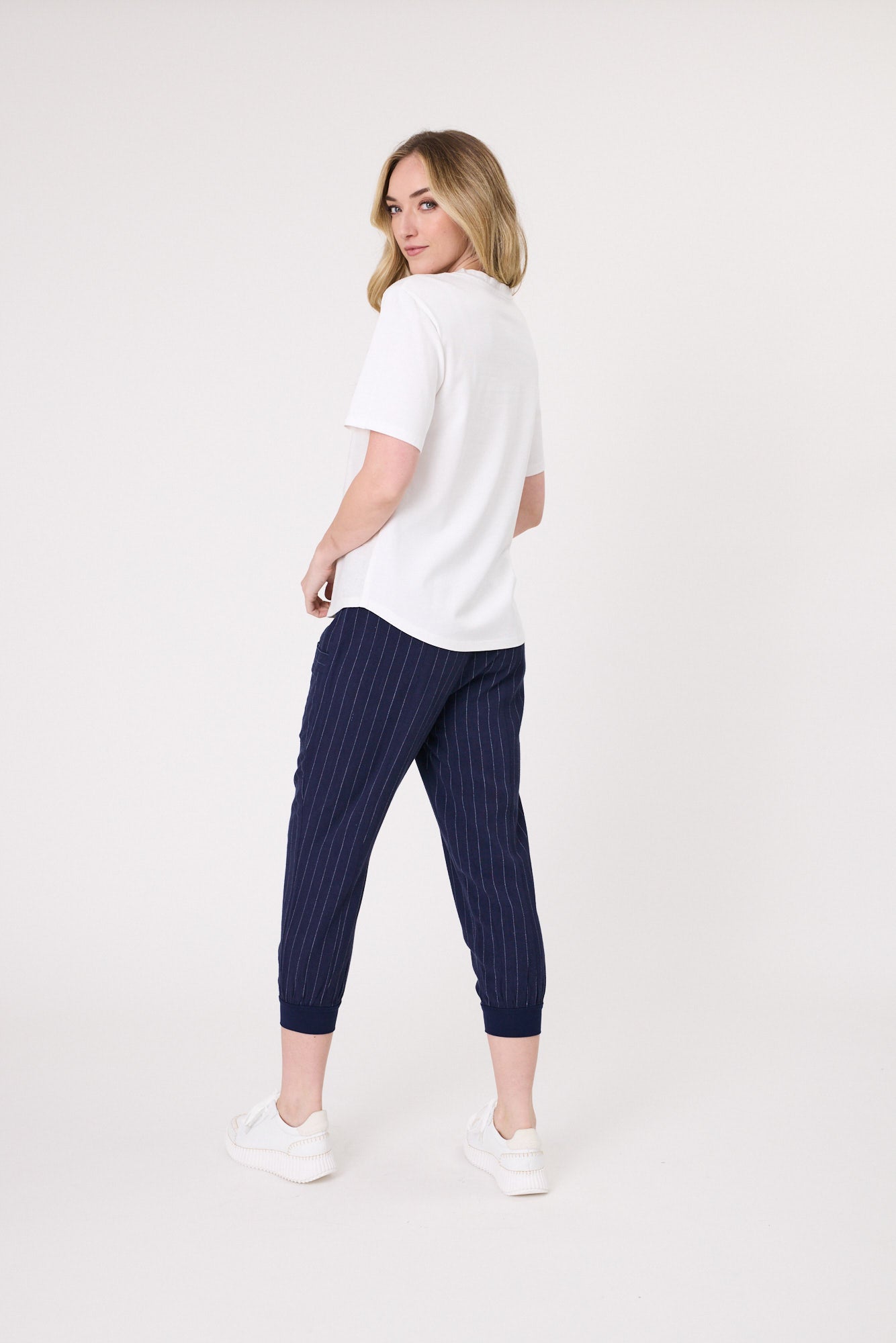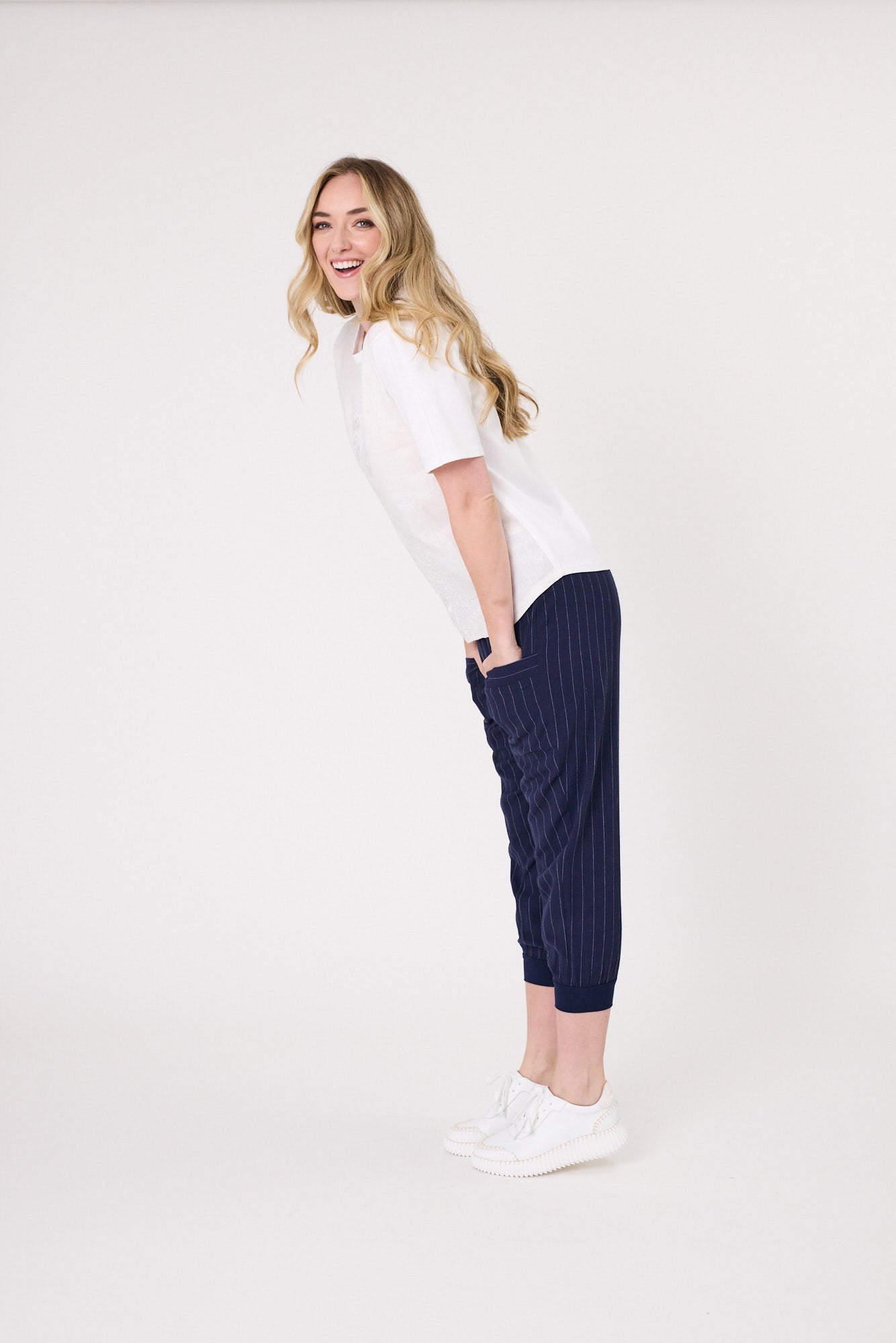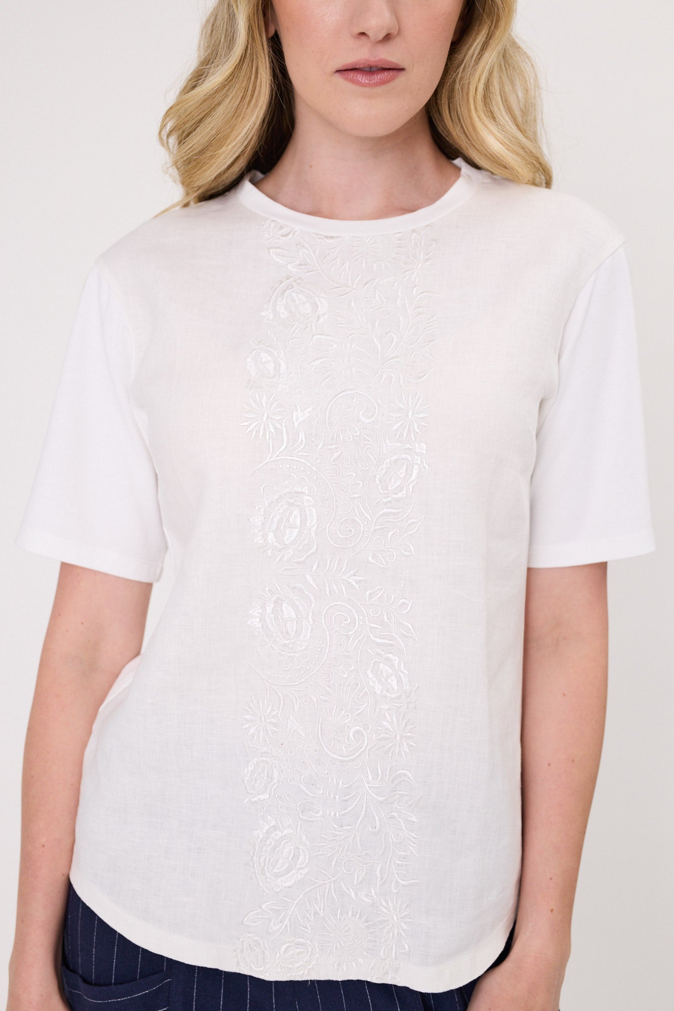 • White crew neck top, cut from linen at the front and cotton jersey on the back