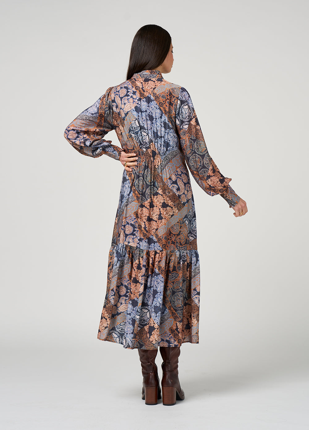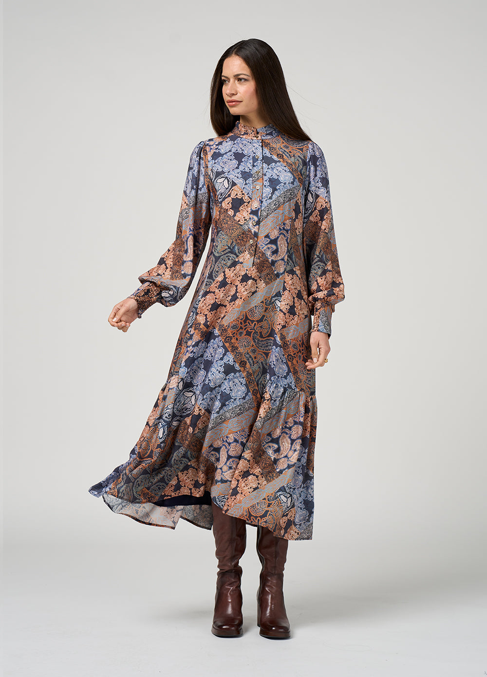 Floaty midi dress with a narrow collar, and a button placket to a dropped waist. Featuring elegant princess panels, a gathered hem panel, and centre back elastic shirring for gentle waist shaping, with deep shirred cuffs.