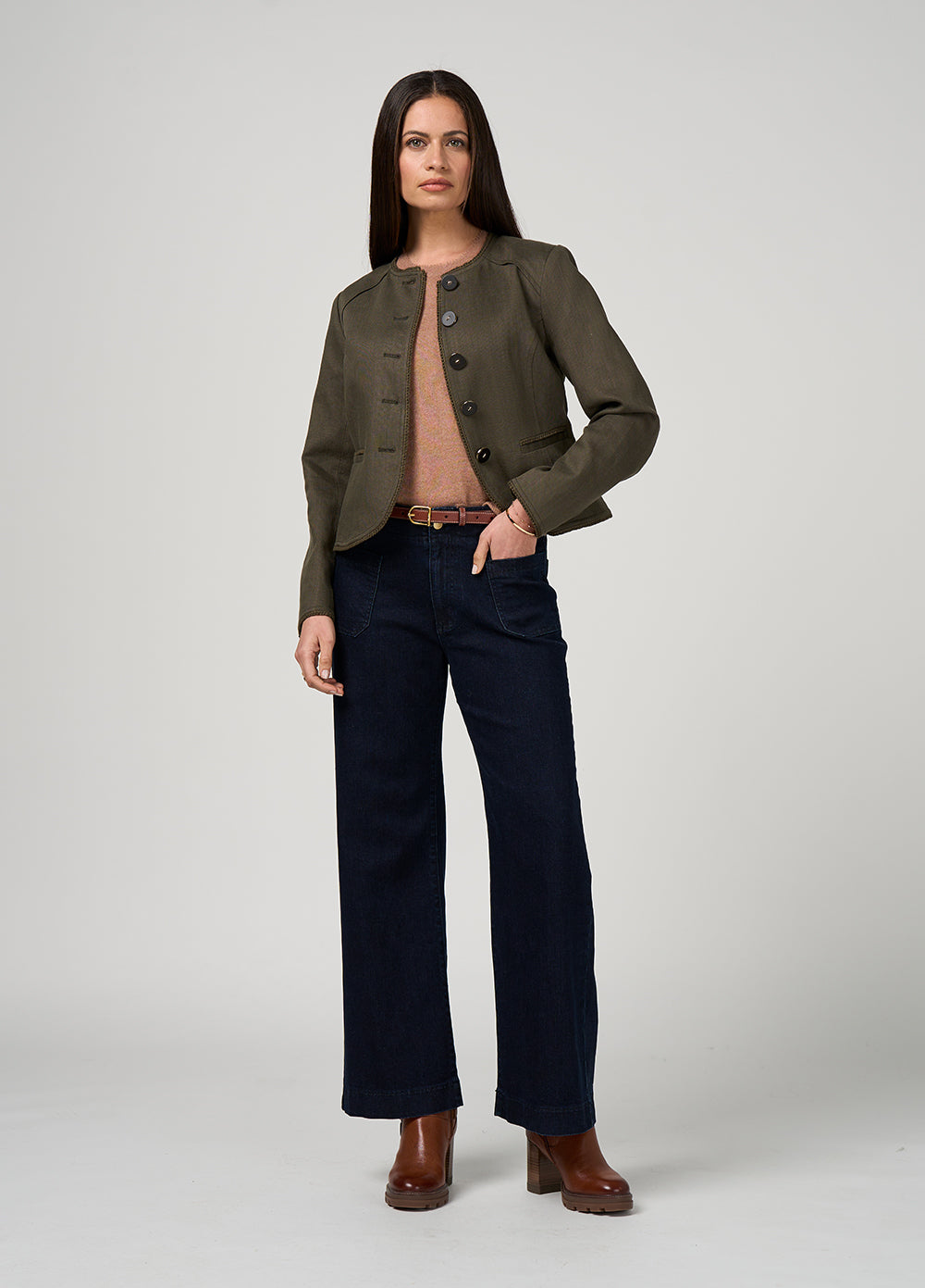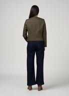 Fitted short-line jacket, beautifully tailored, with a crew neckline, and tonal cotton braid trim for a refined finish. Fully lined with back darts and topstitched panel detailing.