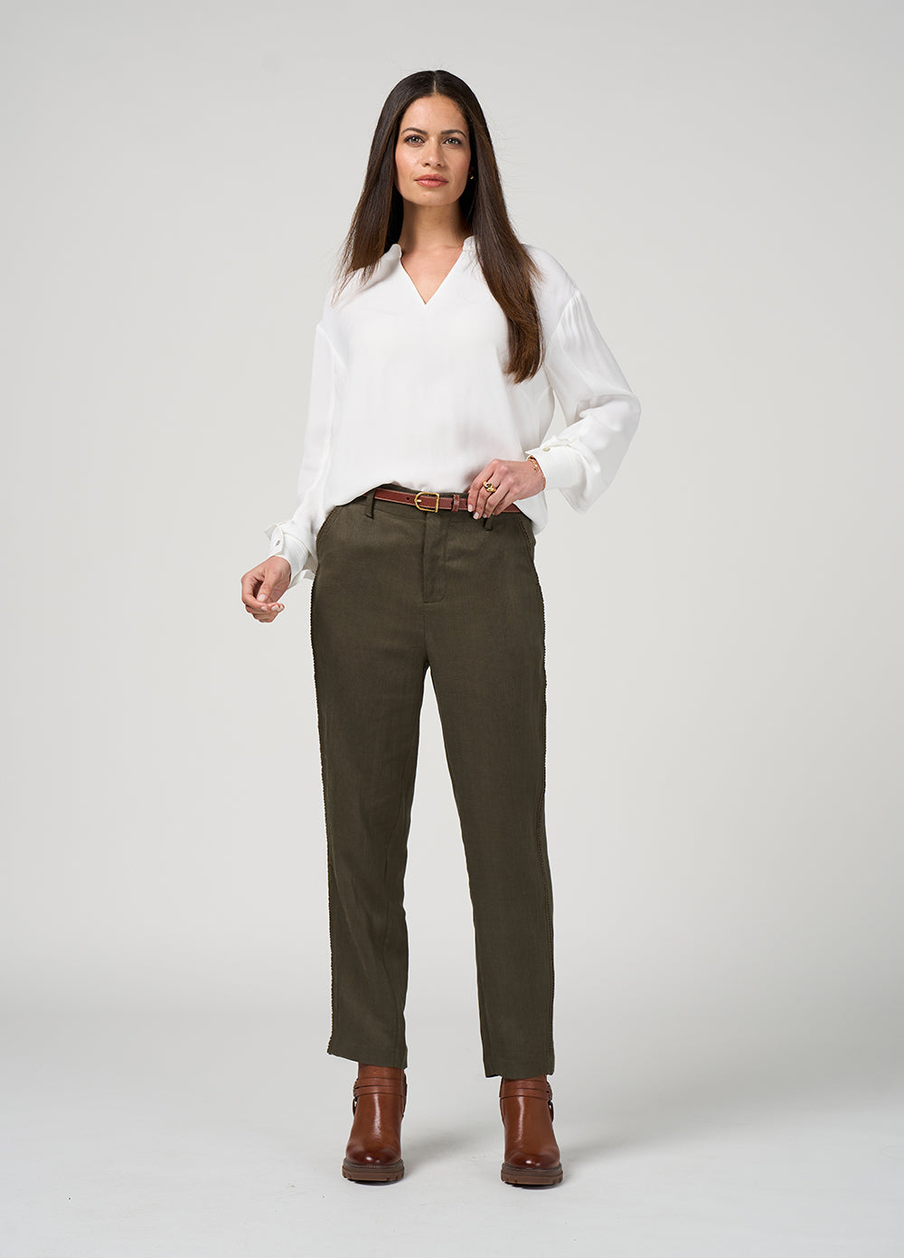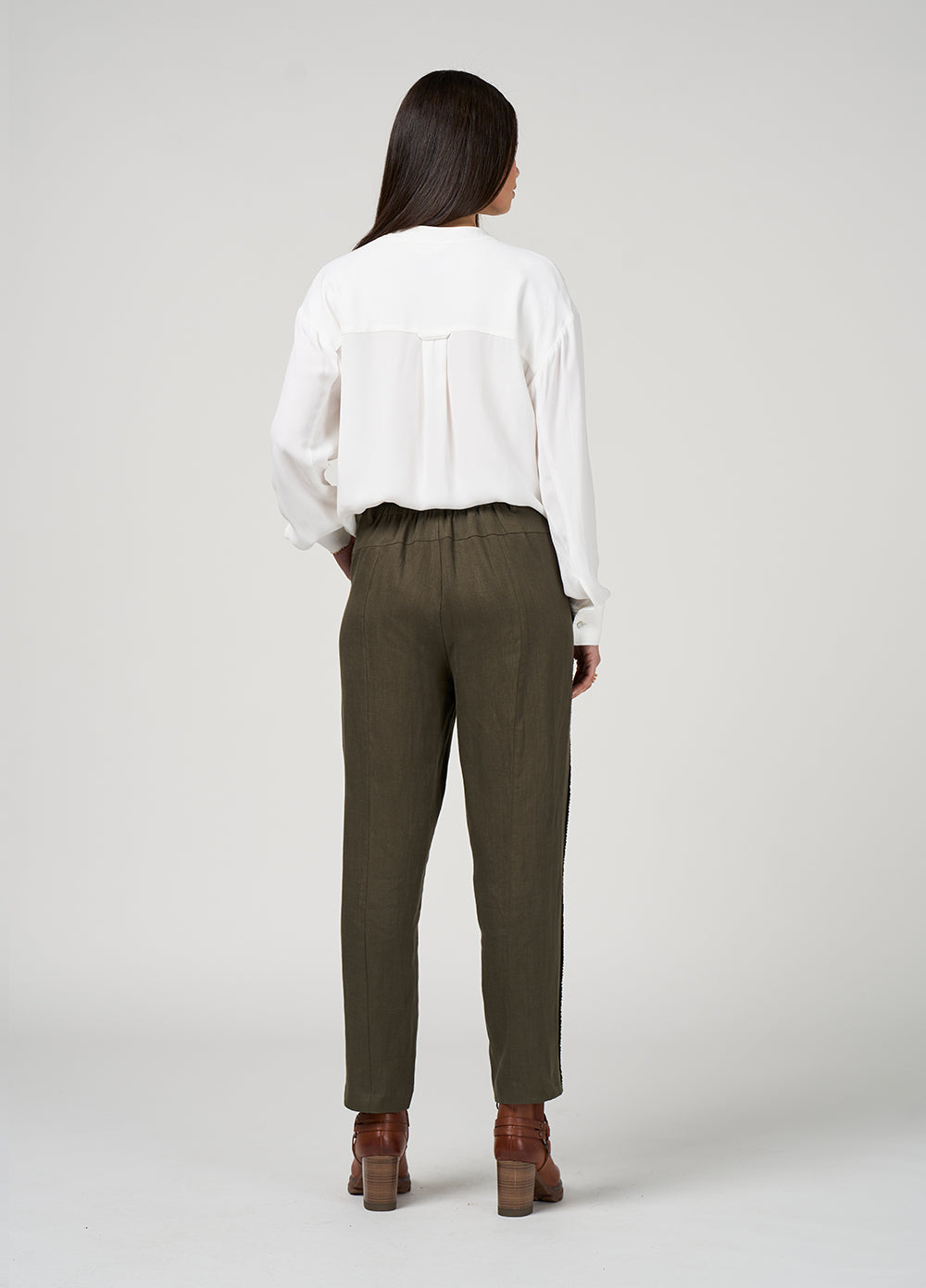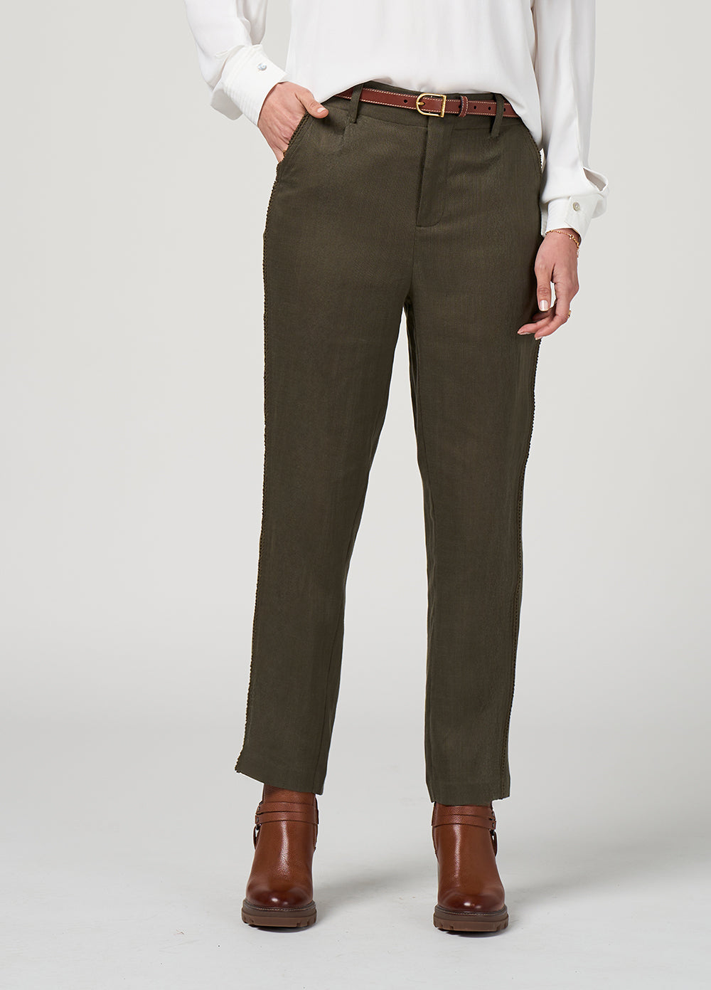 Mid-rise pant with a flat front and tapered leg, featuring tonal cotton braid trim. Designed for comfort and style, with angled front pockets, a functional fly, and an elasticated back panel for an easy, flexible fit.