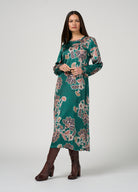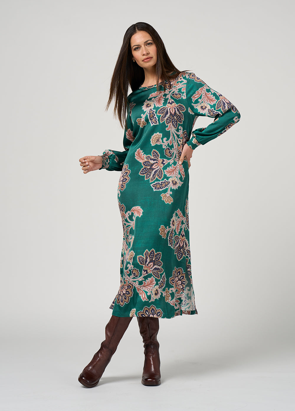 T-shirt midi dress in a stretch sateen with a crew neckline, and a back neck  button-and-loop closure. Designed with deep side splits and half-shirred elasticated cuffs.