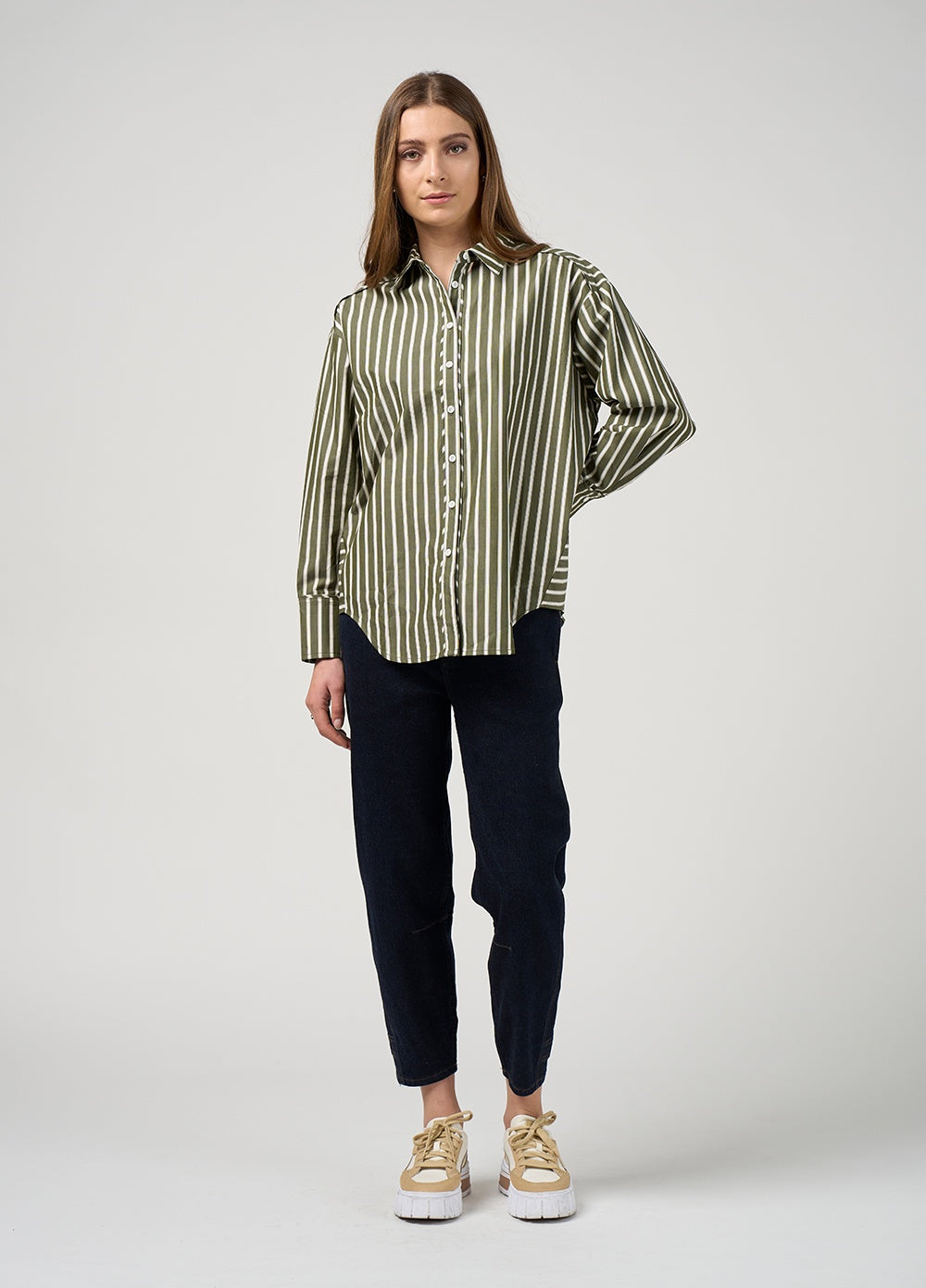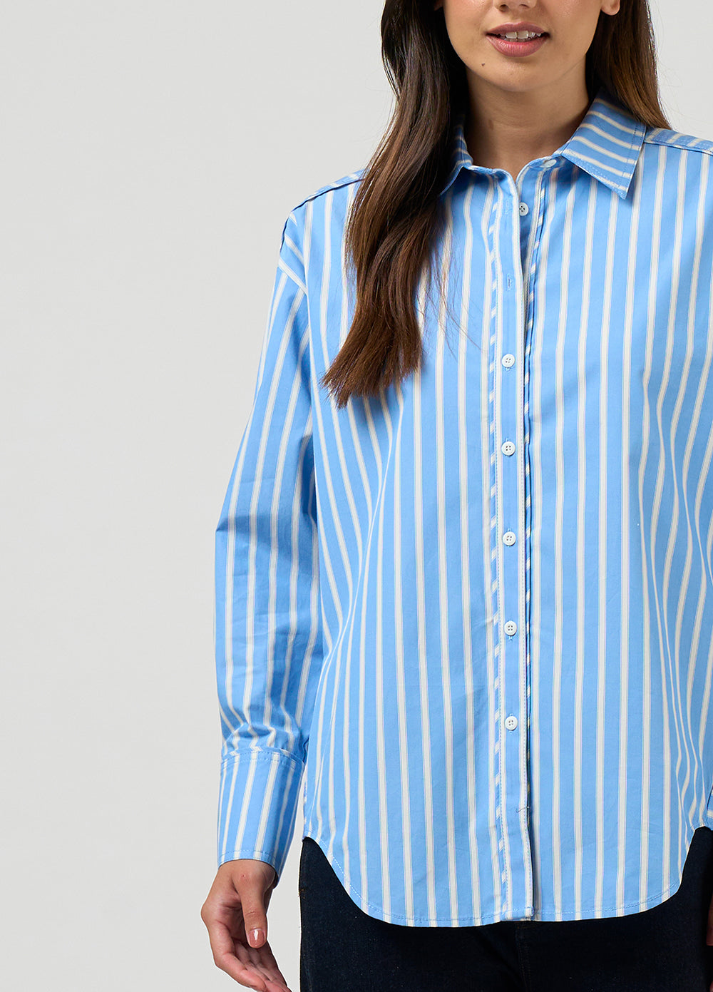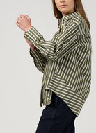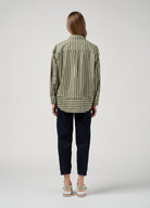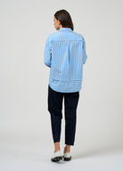 Relaxed fitting stripe shirt with forward side seams, and deep cuffs, featuring a stitched down tuck across the back with flat piping detailing.