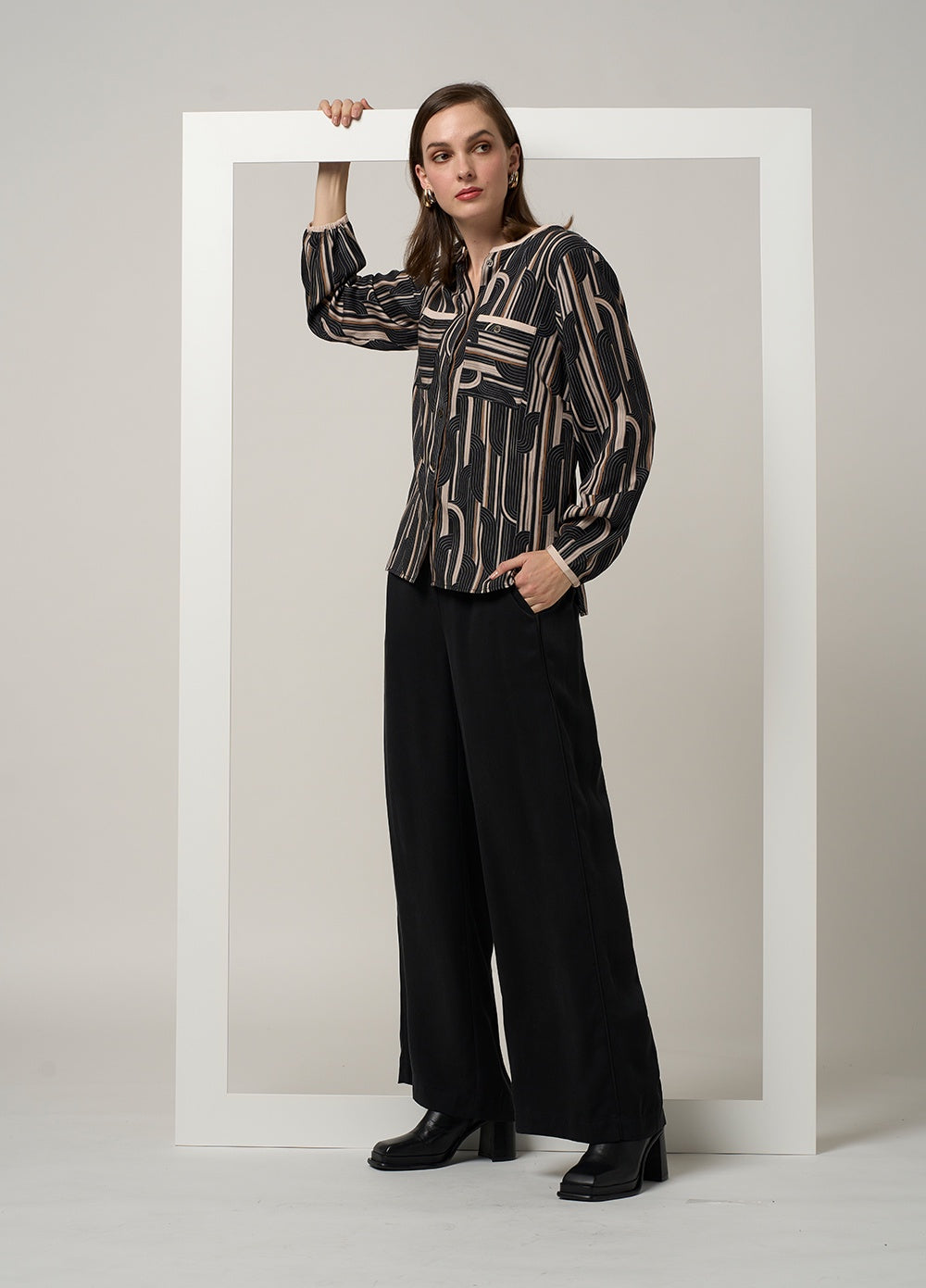 Button-through top with metal buttons and pockets. Featuring contrast binding on neckline, pockets and cuffs.