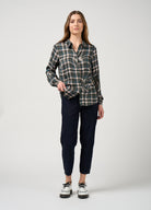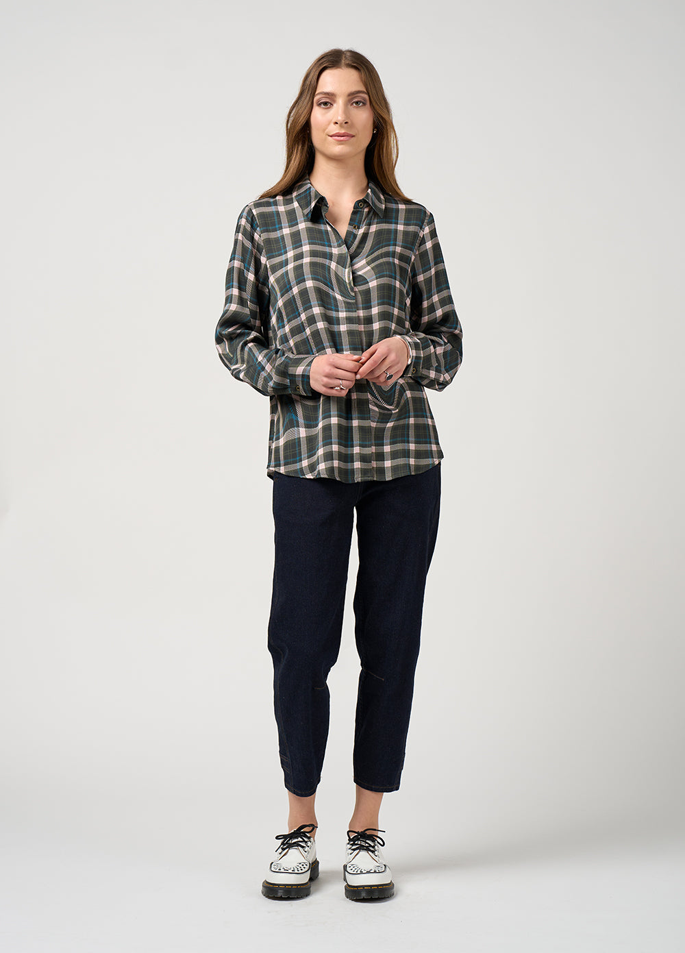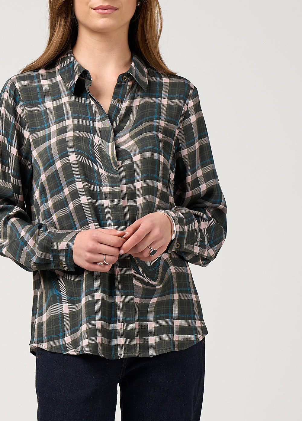 Button-through collared shirt with curved shirt tails, featuring a covered button stand and delicate metal buttons.