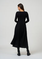 Midi length dress featuring a permanent pleated skirt and a soft slim fitting long sleeve crew neck bodice, perfect for layering.