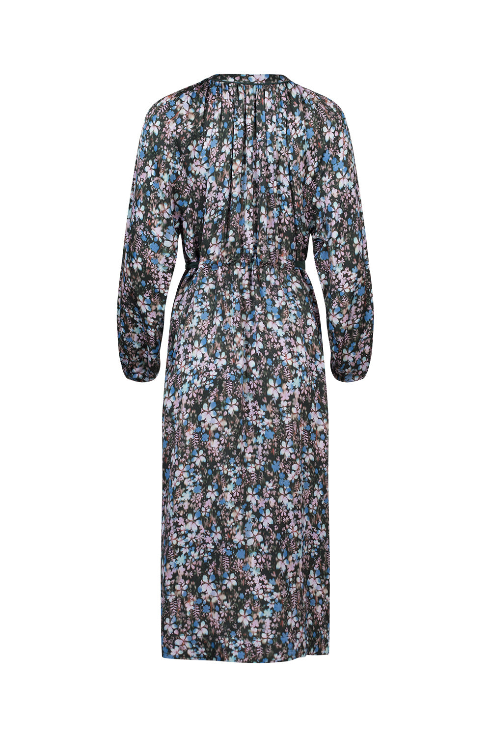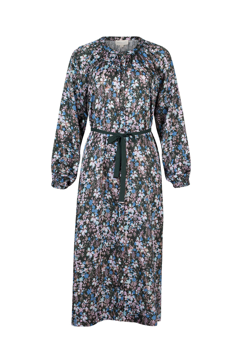 Printed button-through shirt dress with metal buttons and blouson raglan sleeves, with elasticated cuffs. Featuring a contrast belt through channel at back waist for added shape.