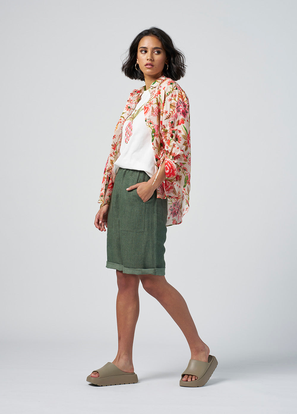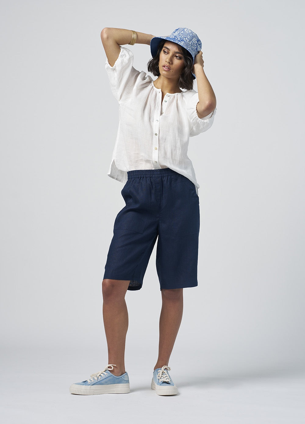 Below the knee length short in a linen blend, with an elasticated waistband, featuring top stitched front patch pockets.