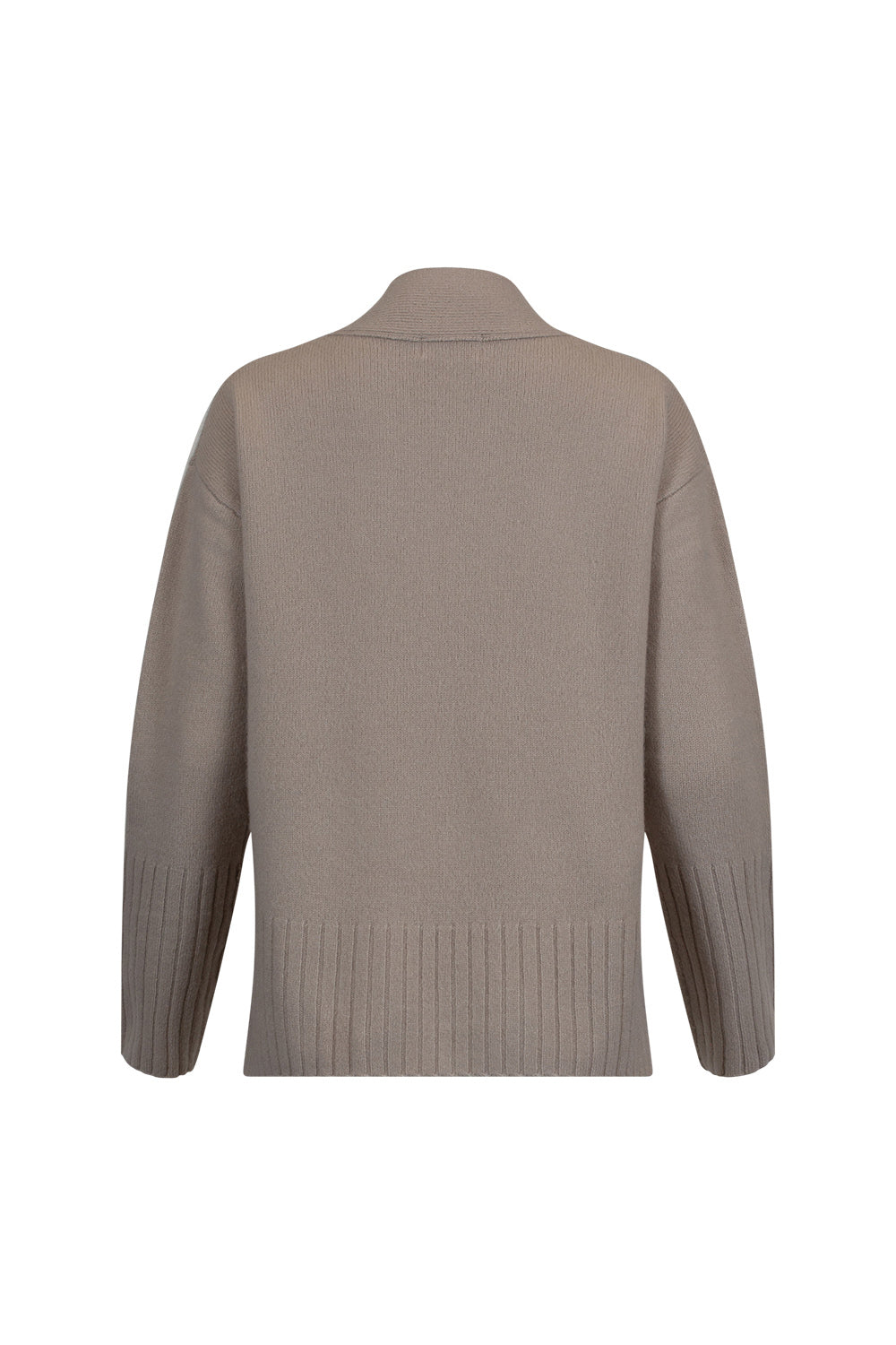 V-neck sweater with centre front detail, exposed seams and deep ribbed cuffs and hem.