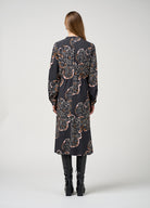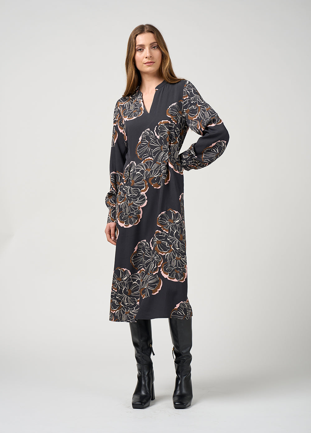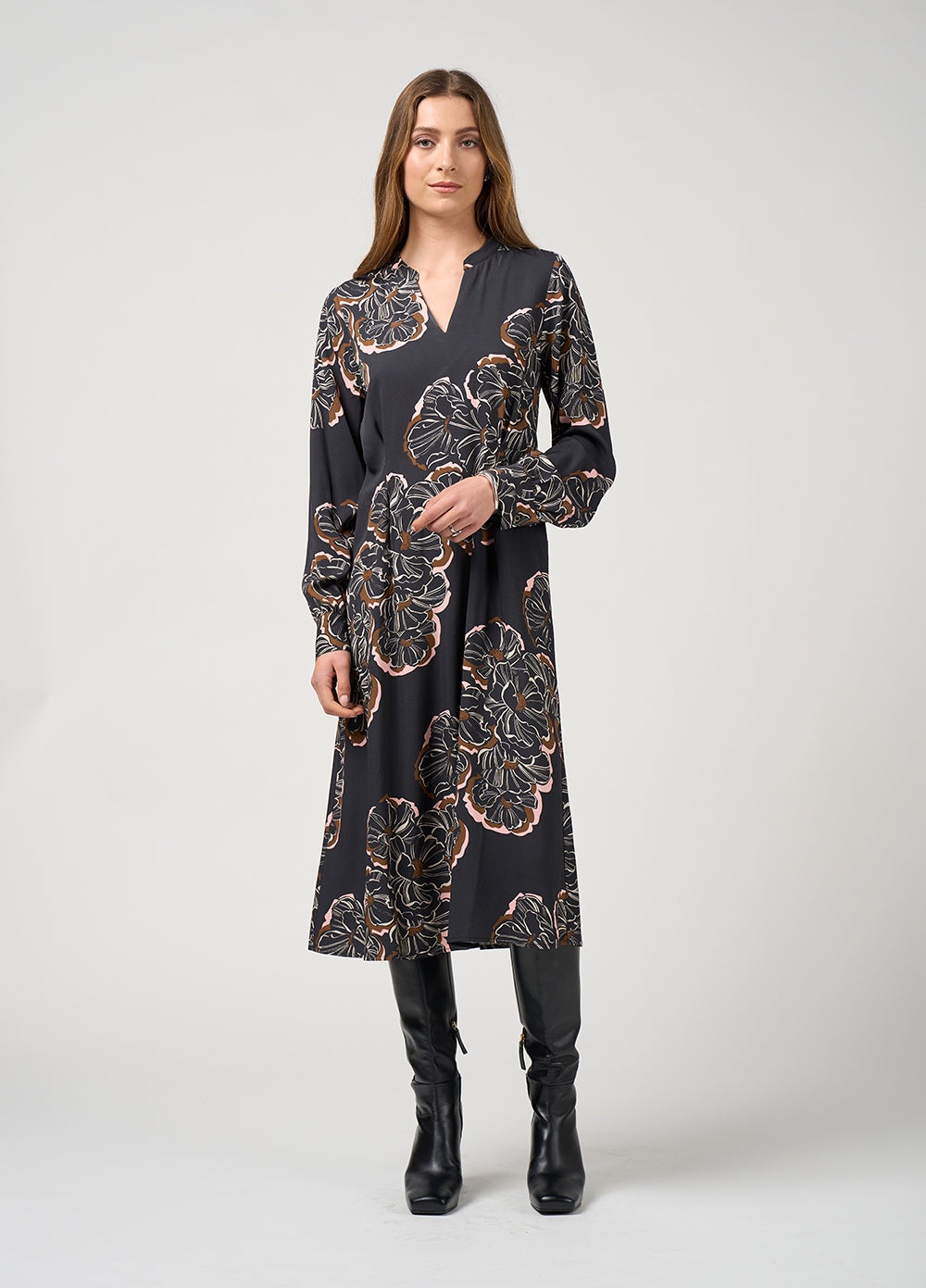 An easy-fitting midi dress with front waist tucks and an elasticated back waist for relaxed shape and comfort. Finished with topstitched side seam pockets and buttoned cuffs.