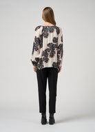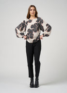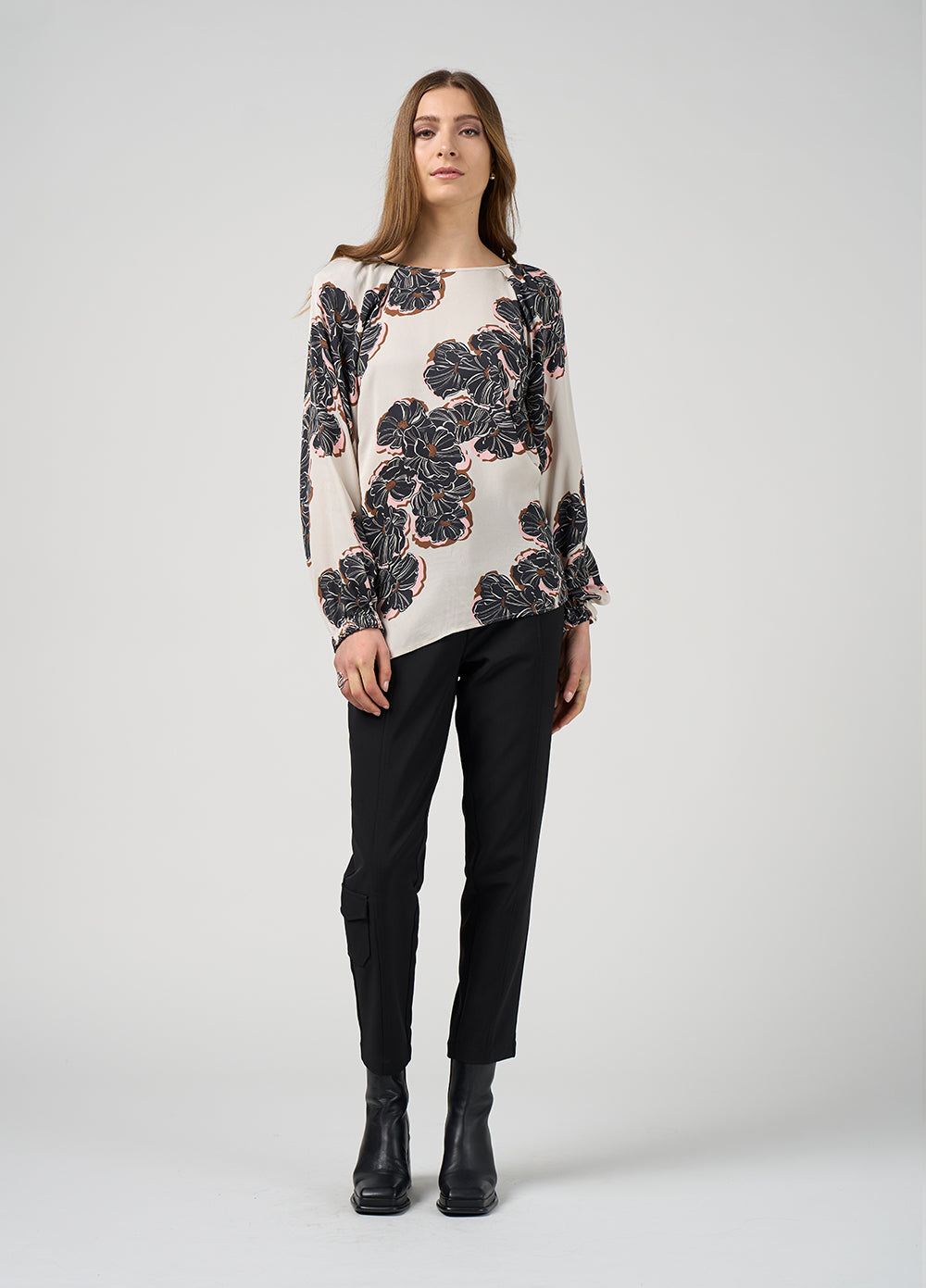 Printed blouse with a round neckline, and back neck split with button-and-loop closure. Featuring raglan sleeves with hidden tucks and softly gathered shoulders, creating gentle volume through the sleeve, with elasticated cuffs.
