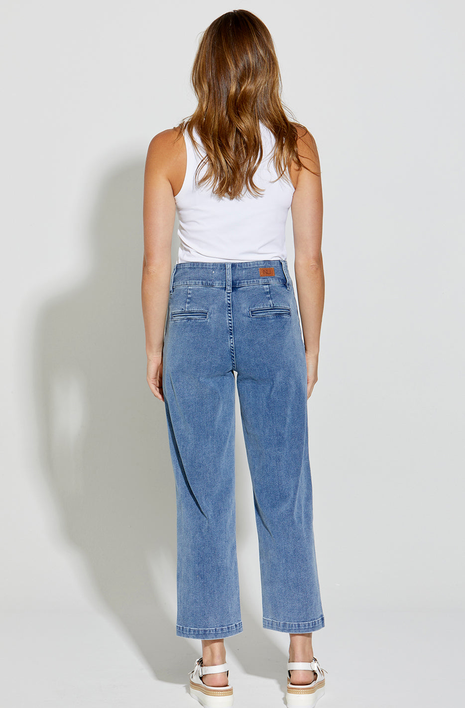 75% Cotton 23%Polyester 2% Spandex – Soft lightweight denim fabric. On trend wide leg ankle grazer. 29cm rise. 27 inch inseam. Welt pocket detailing. 46cm circumference around hem.