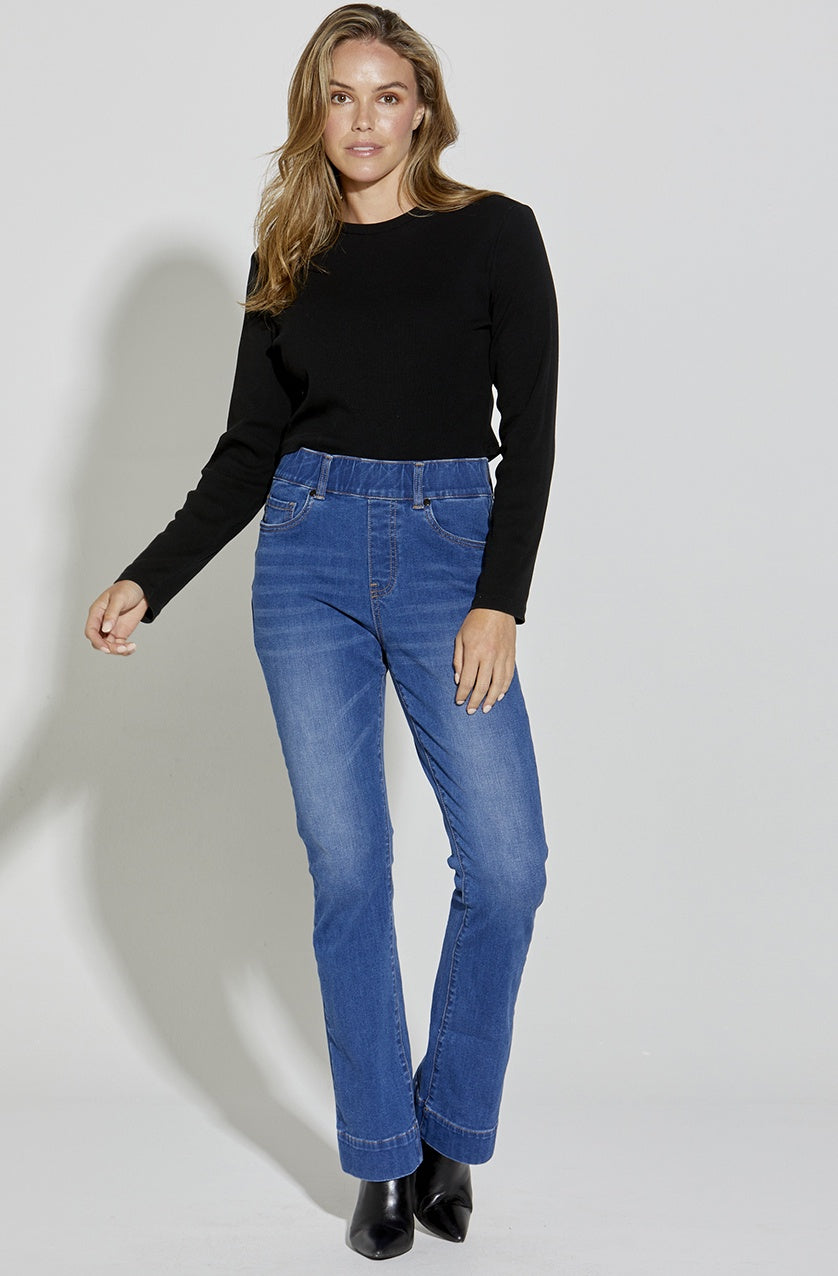 80% Cotton 10% Polyester 10% Spandex – Flattering and oh so comfortable, pull on high rise kick flare jean. Elasticated waistband. 31inch inseam.