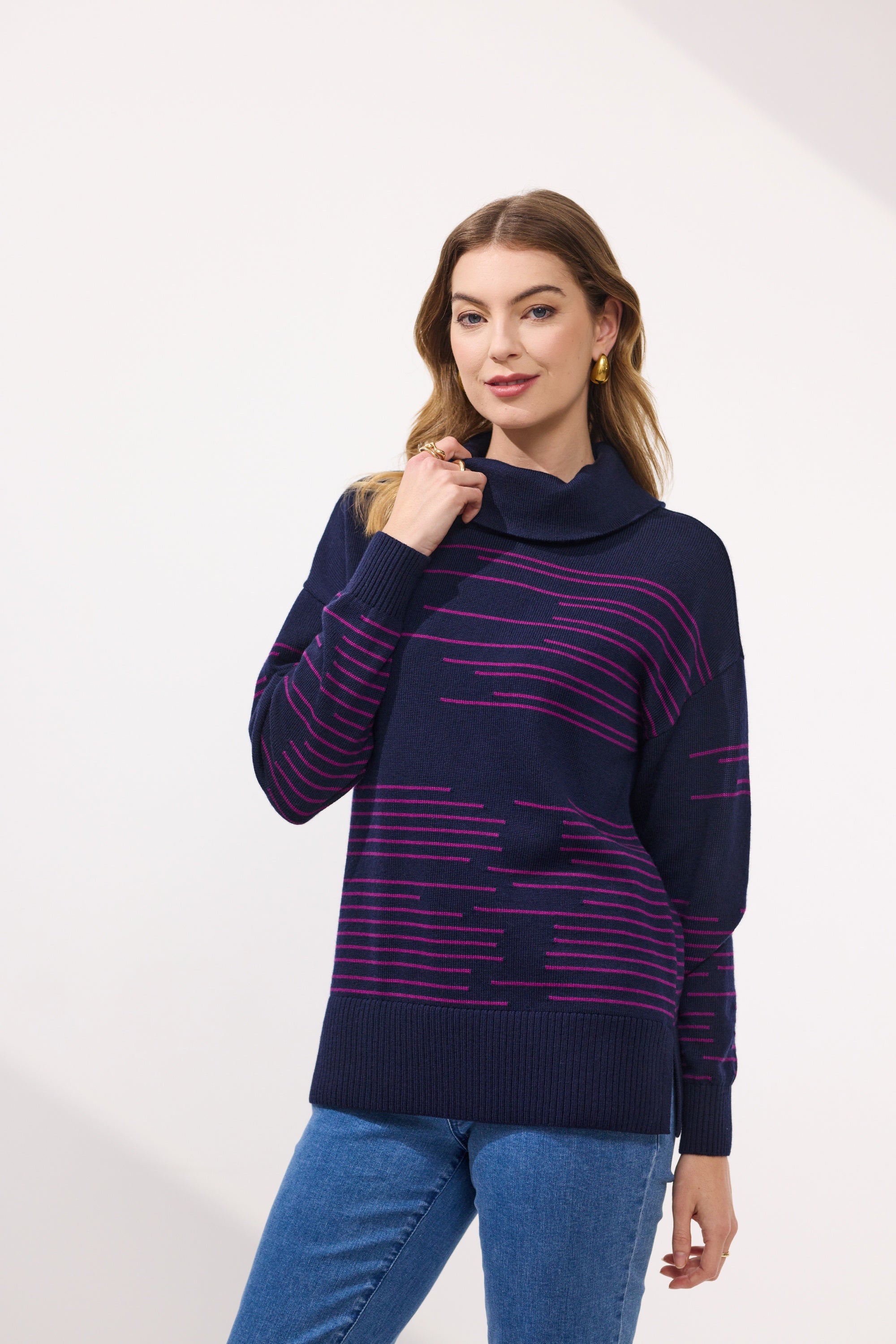 This cozy striped long sleeve jumper is the perfect blend of style and comfort. Featuring a roll neck and ribbed cuffs and hem, this 100% Merino jumper is designed for a relaxed fit while keeping you warm.