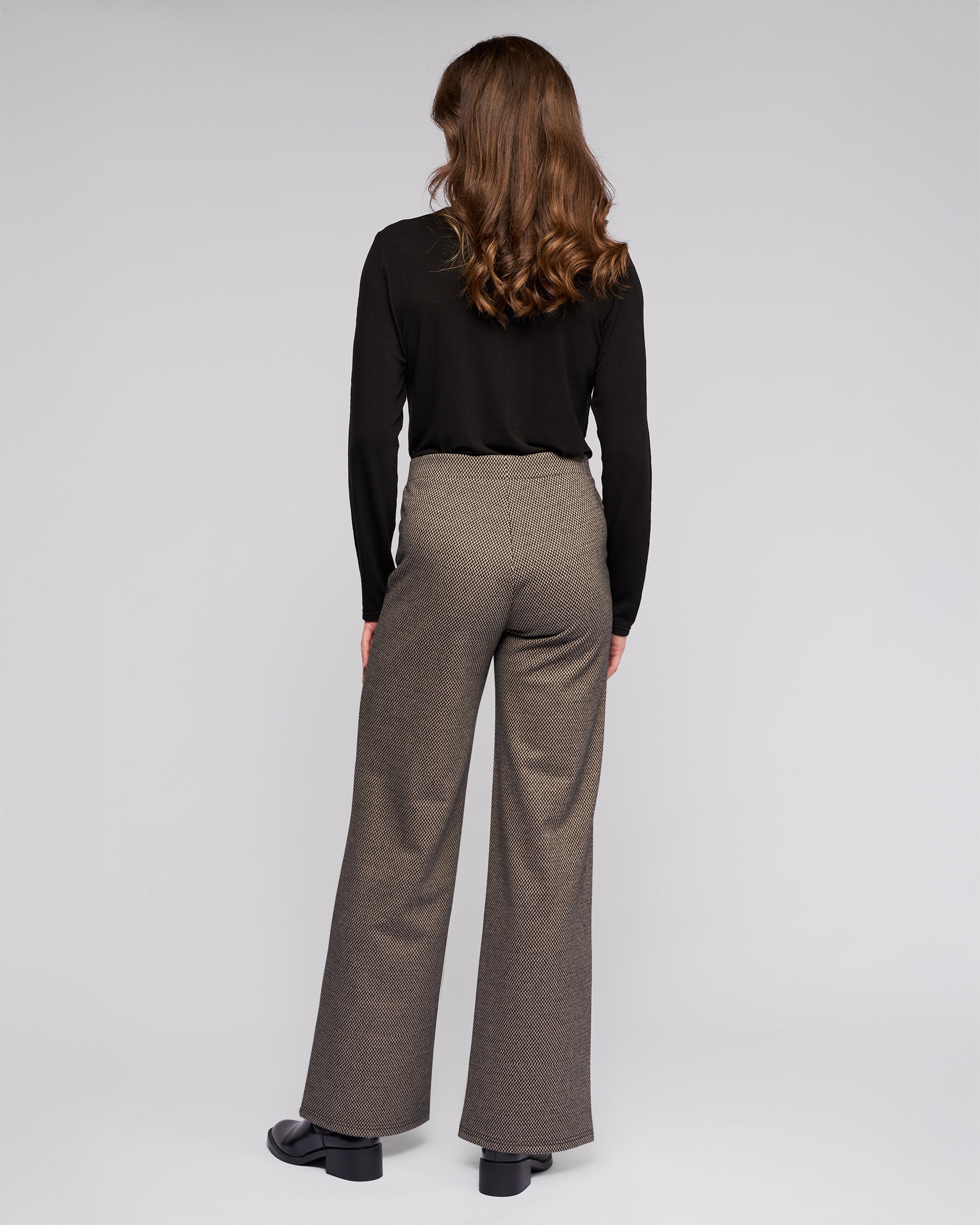 Full-length wide-leg pant in a soft stretch knit, designed in our Knox print — a black and oat check pattern. The easy pull-on style and elasticated waistband offer comfort and ease, while the drape of the knit fabric creates a smooth, elegant silhouette.